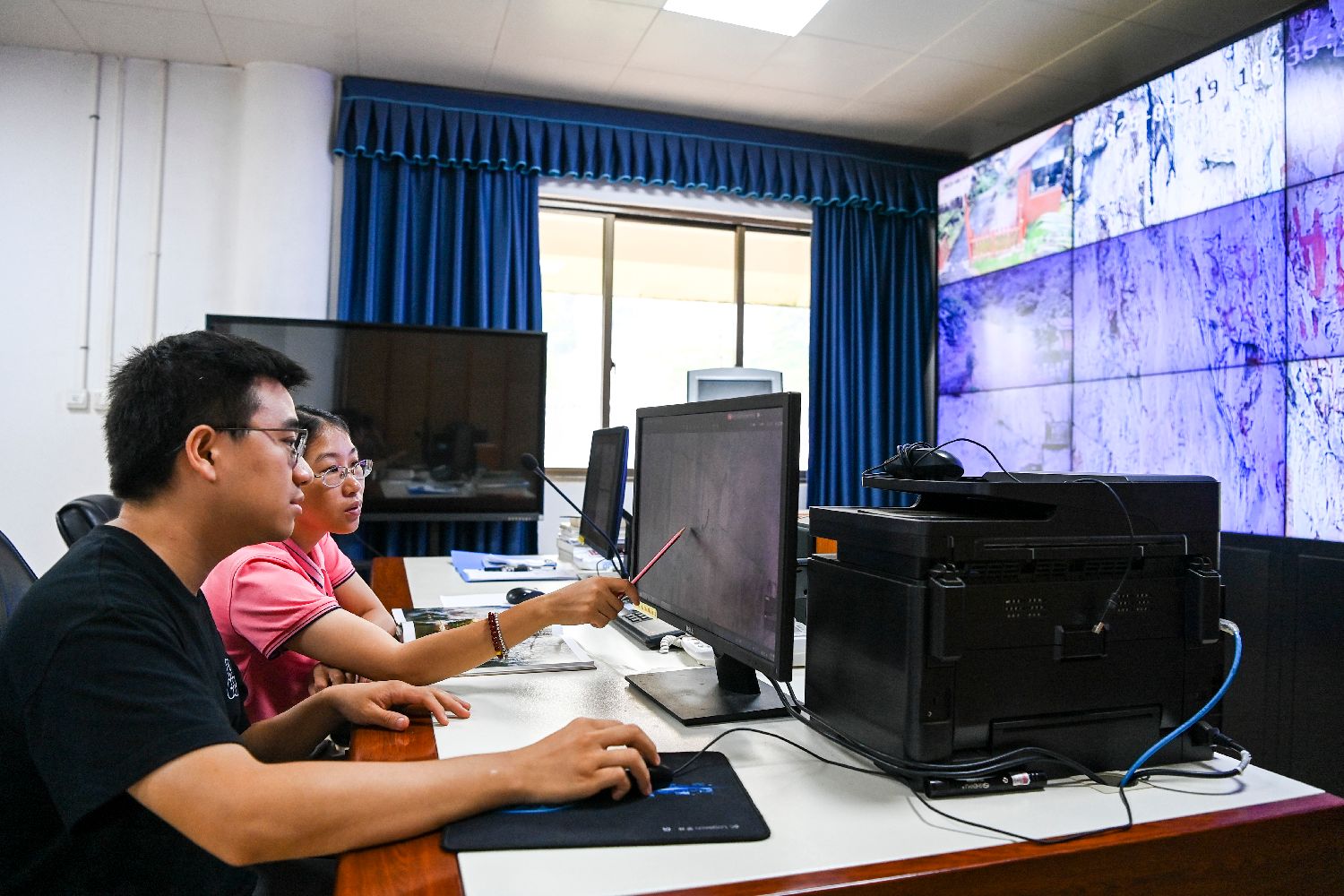 6月19日,在位于广西宁明县的花山岩画监测站,工作人员通过监控设备查看岩画情况。