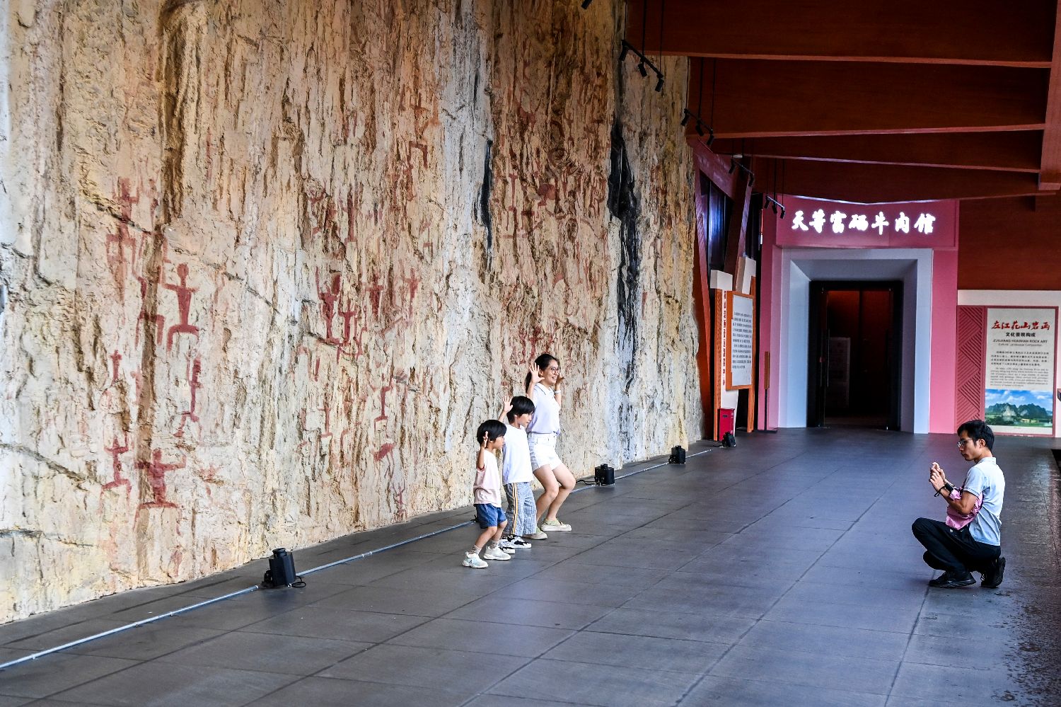 6月22日,在广西宁明县花山岩画景区游客中心,游客与墙壁上的仿真岩画合影。