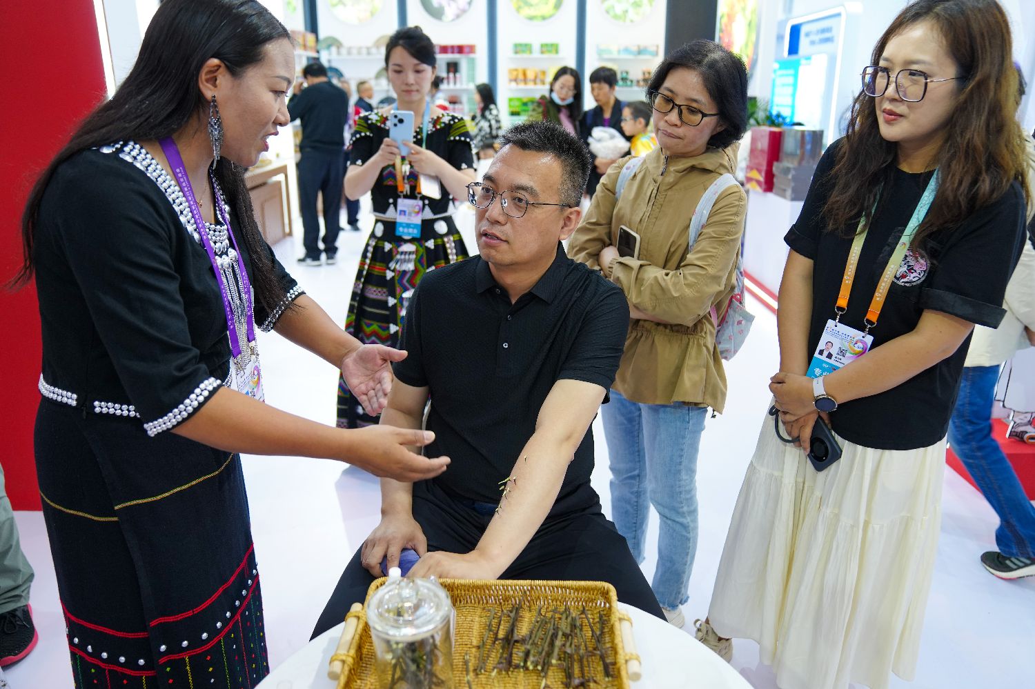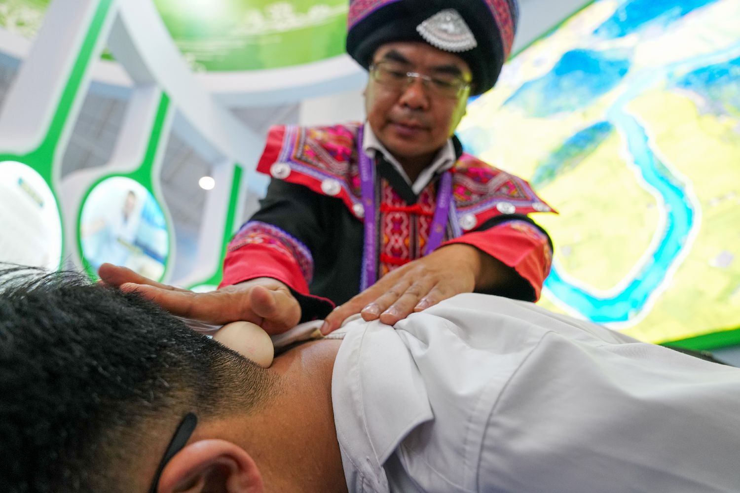在昆明举办的第9届中国—南亚博览会暨第29届中国昆明进出口商品交易会上,彝医、壮医等集中亮相医疗体育康养馆,传统医学的现场展示吸引众多观众体验。
