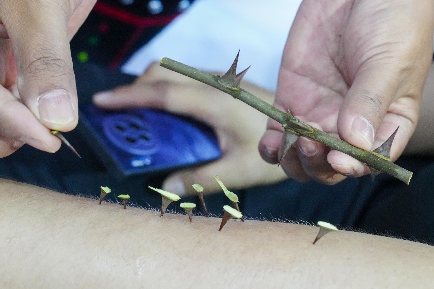 图为观众体验拉祜族松明疗法。(图片来源:本文图片均自中新社)