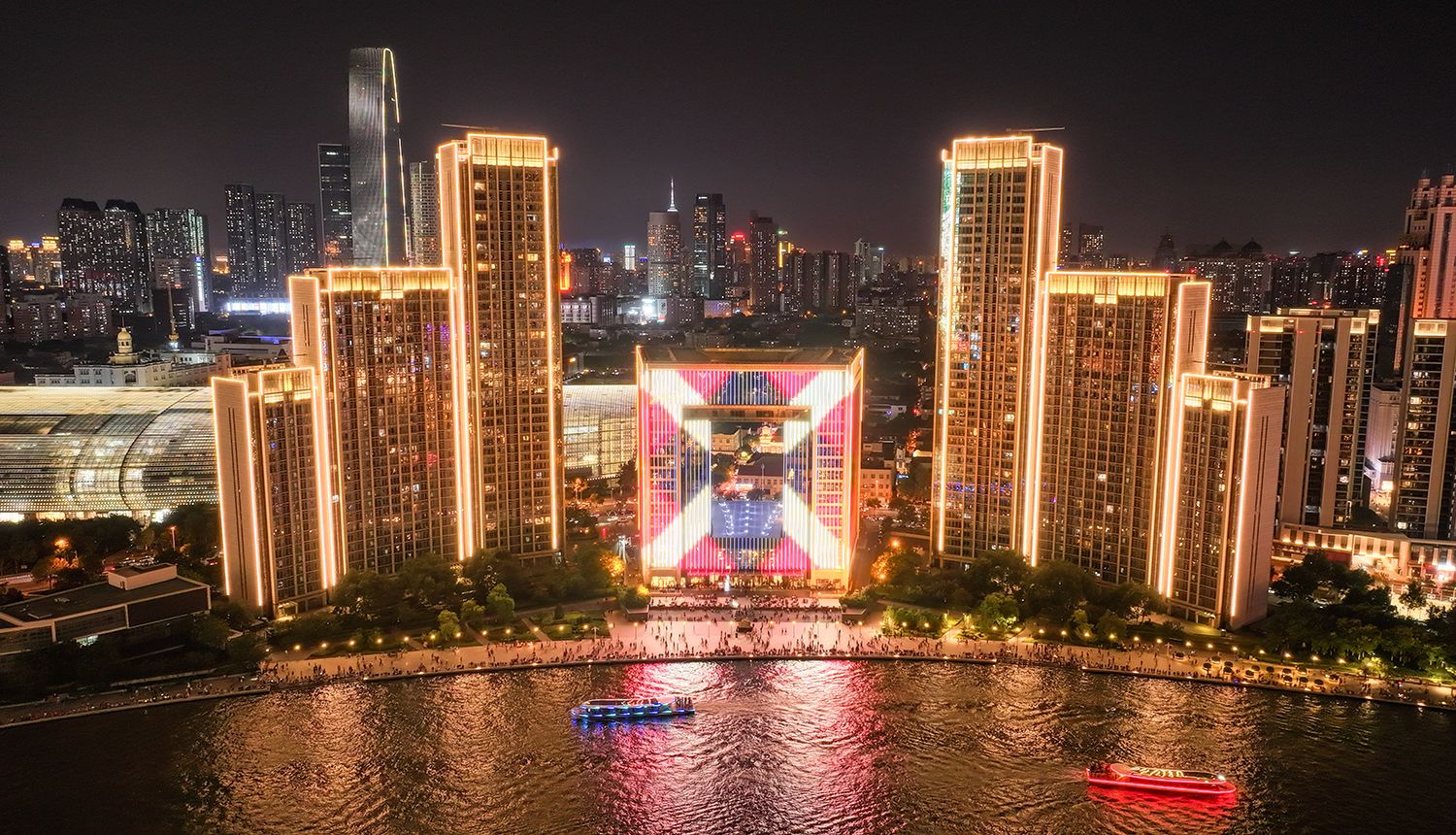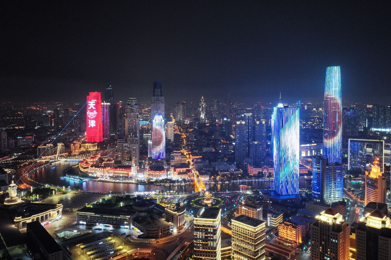 世界经济论坛第十六届新领军者年会(又称“夏季达沃斯论坛”)即将在天津开幕。夜色下的天津灯光璀璨,多座地标性建筑点亮楼体灯光,流光溢彩迎接中外宾朋。