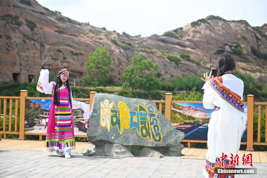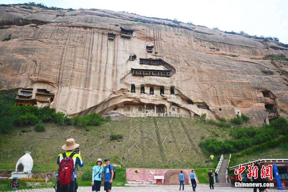 6月23日,游人在位于甘肃省张掖市肃南裕固族自治县祁连山下的马蹄寺石窟前拍照。