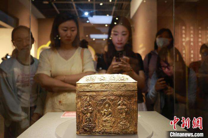 图为6月24日,游客观看法门寺出土的“鎏金四十五尊造像盝顶银宝函”。(图片来源:本文图片均据中新网)