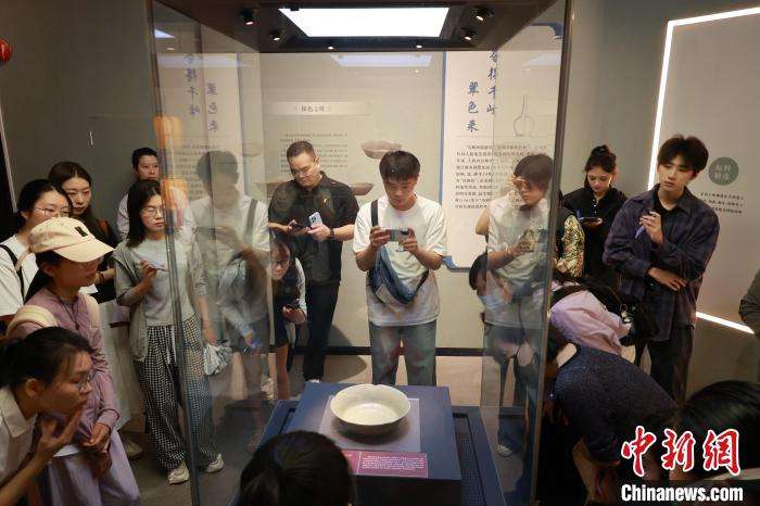 图为6月24日,游客观看法门寺出土的“五瓣葵口大内凹底秘色瓷盘”。