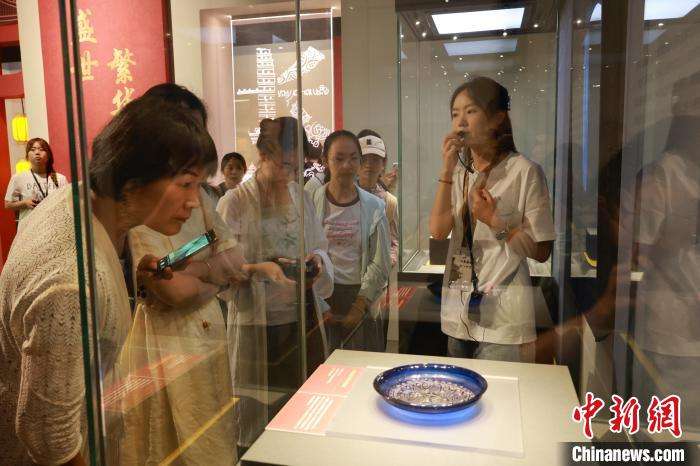 图为6月24日,游客观看法门寺出土的“八瓣团花纹蓝色琉璃盘”。