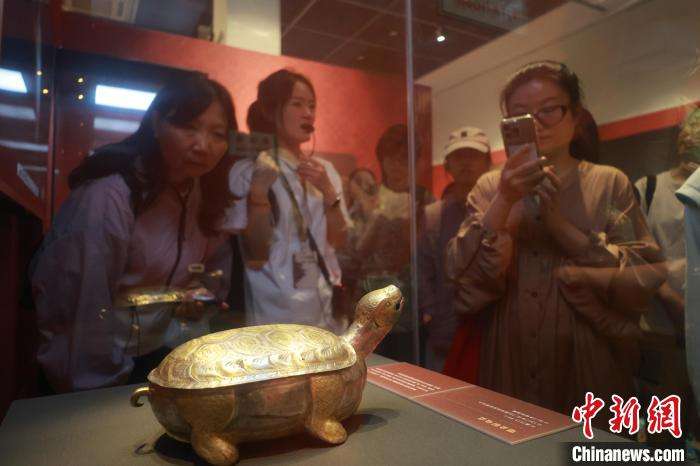 图为6月24日,游客观看法门寺出土的“鎏金银龟盒”。