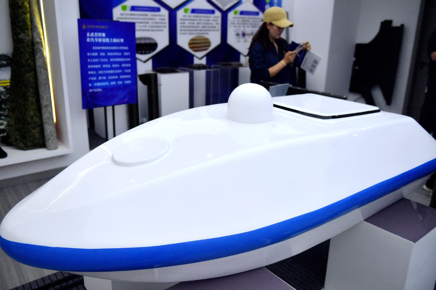 6月24日在围场县一家玄武岩纤维生产企业展厅内拍摄的玄武岩纤维复合材料无人船。