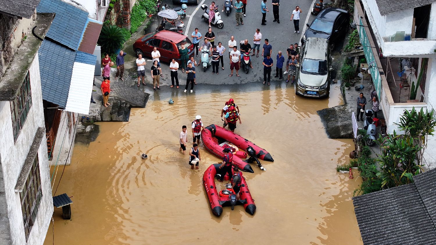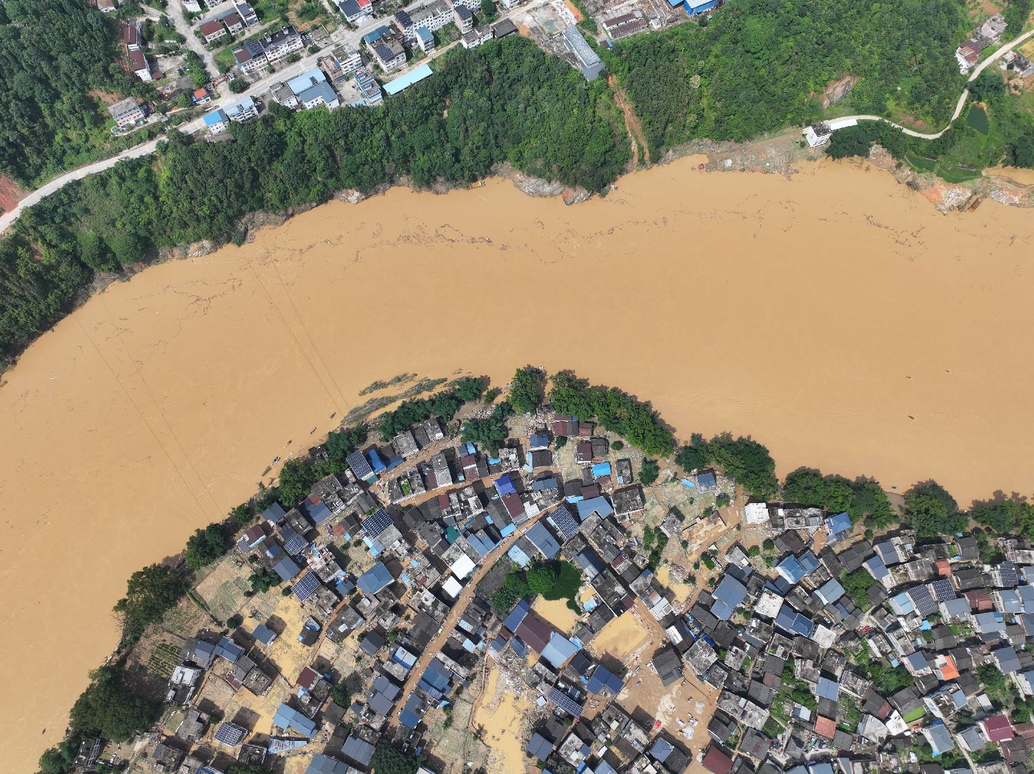 6月25日,广西融安县城部分街道被淹,救援人员用皮划艇帮助群众出行(无人机照片)。(图片来源:本文图片均据新华社)