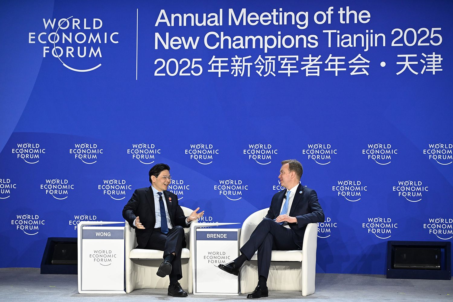 6月25日,在国家会展中心(天津),新加坡总理黄循财(左)和世界经济论坛总裁博尔格·布伦德出席分论坛。