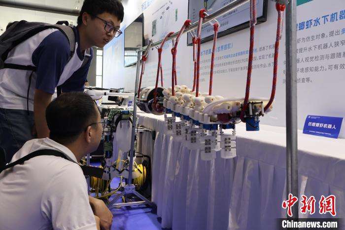 图为6月26日,参会者参观仿螳螂虾水下机器人,其可自主实现水下目标识别与跟随。