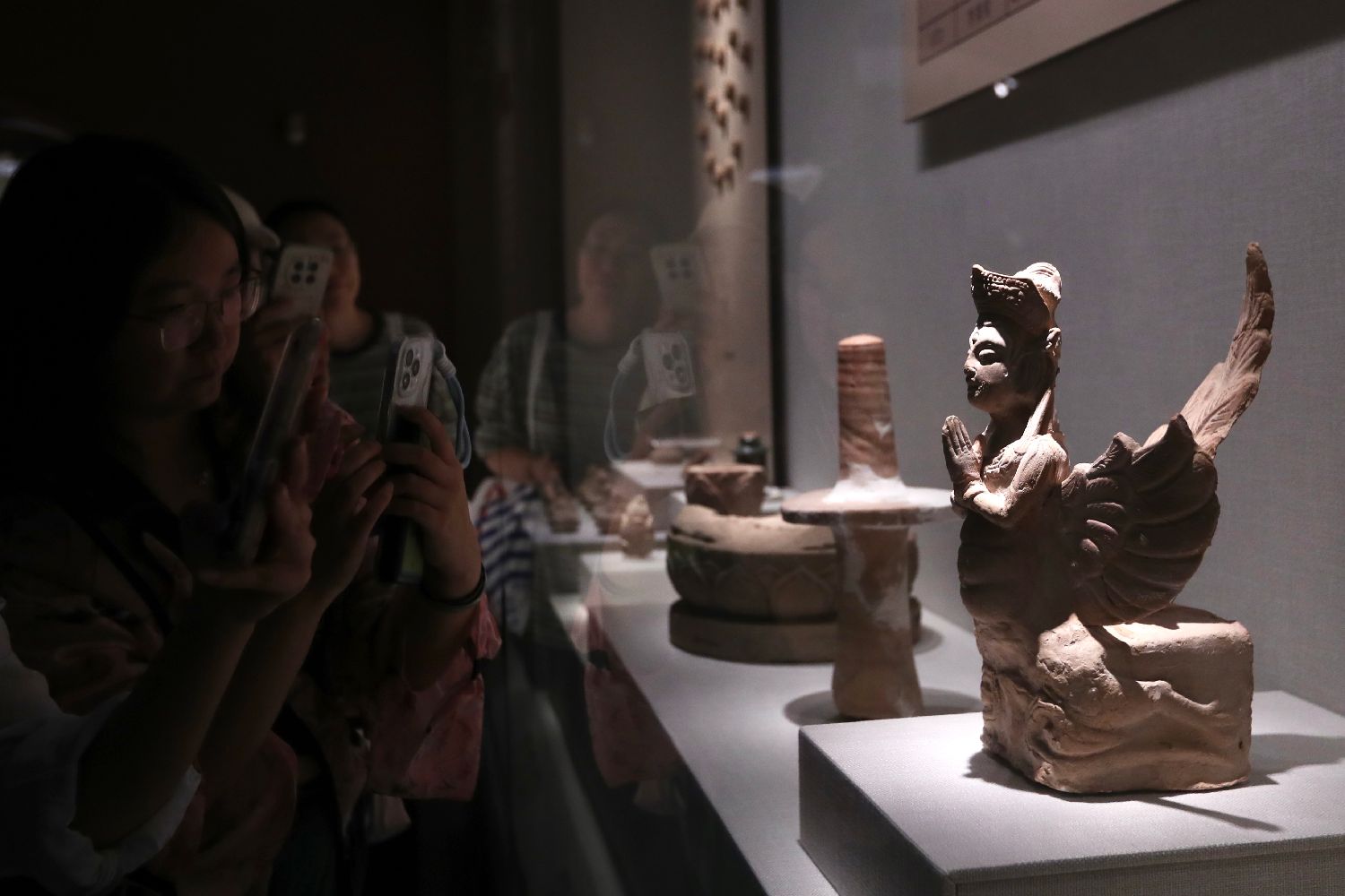 在西夏陵博物馆展出的红陶迦陵频伽吸引参观者。据悉,迦陵频伽又称妙音鸟,在佛经记载中妙音鸟能给人带来幸福。