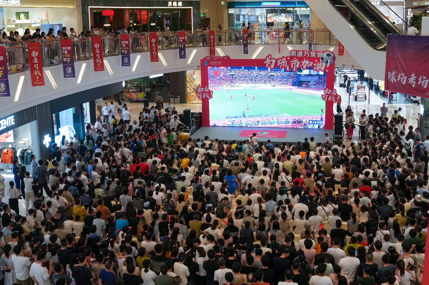 6月29日,“苏超”(2025江苏省城市足球联赛)第五轮南通队坐镇主场对阵宿迁队。南通城区内众多商场、景区、户外广场利用室内外大屏进行赛事直播,开启观赛“第二现场”,方便市民、球迷“全域”观赛,享受比赛带来的快乐。
