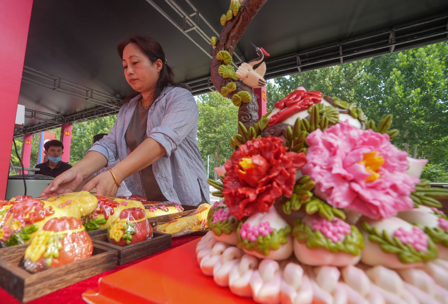 6月28日,“黄河大集”田园丰收市集的一位摊主在整理花馍。