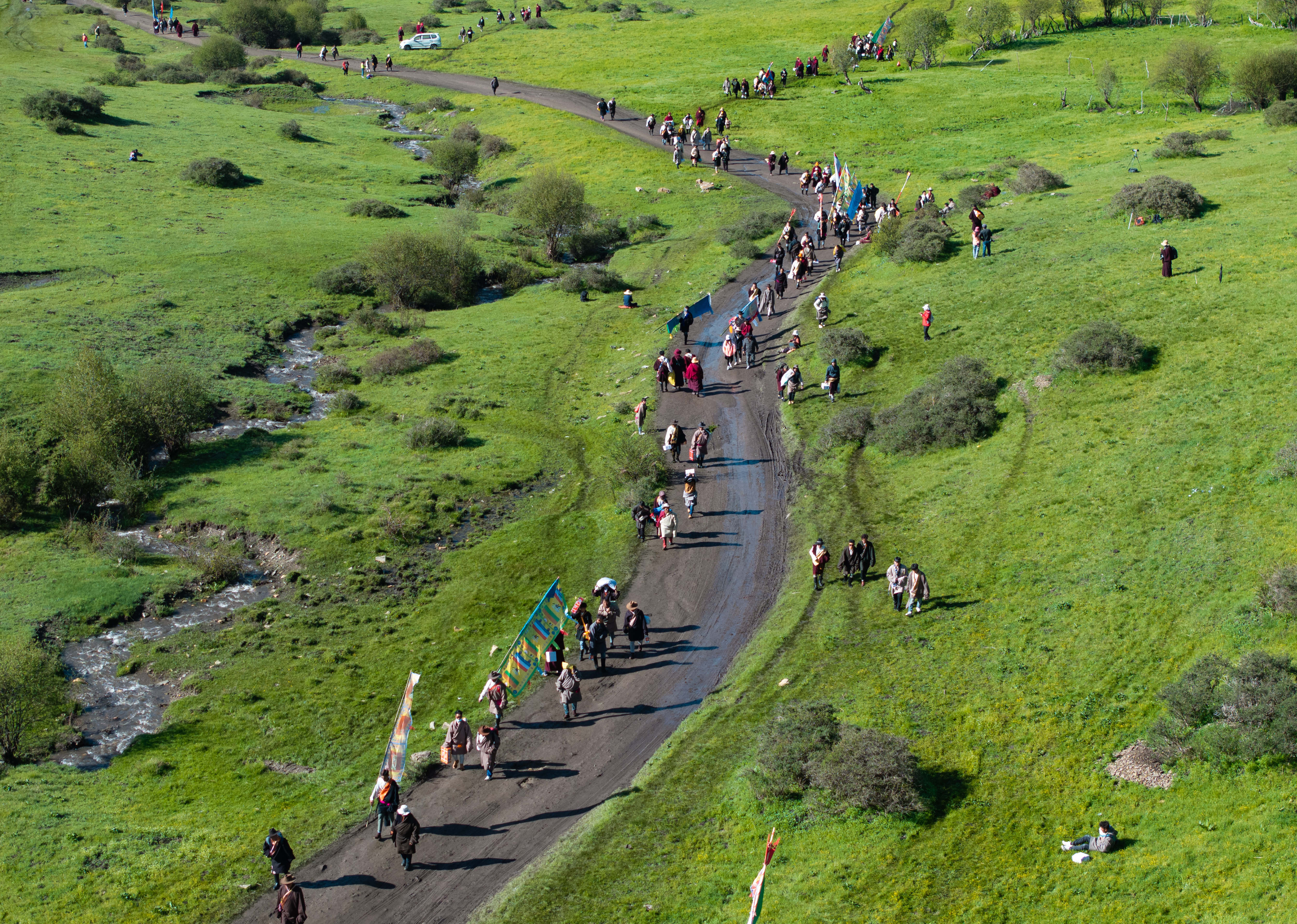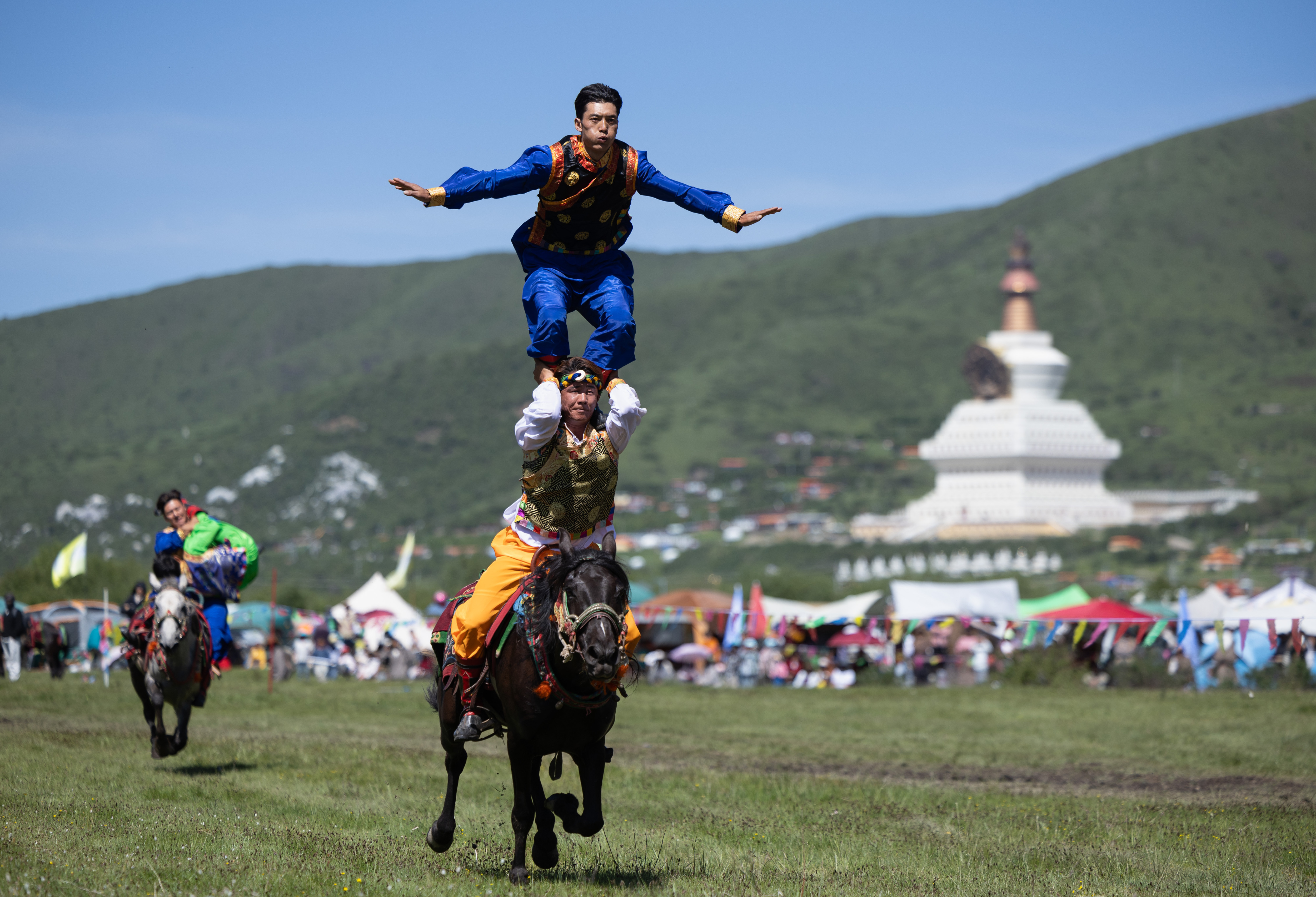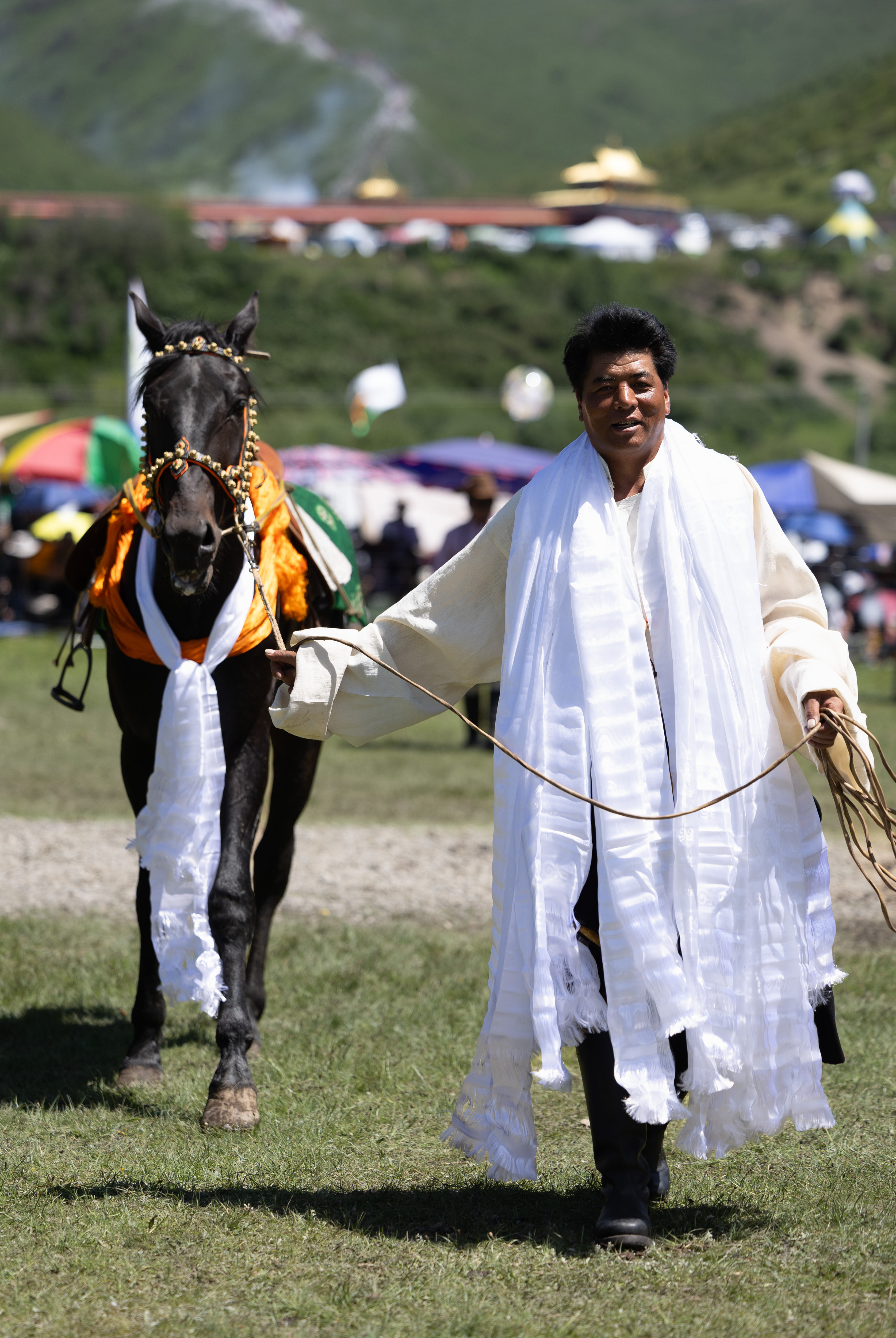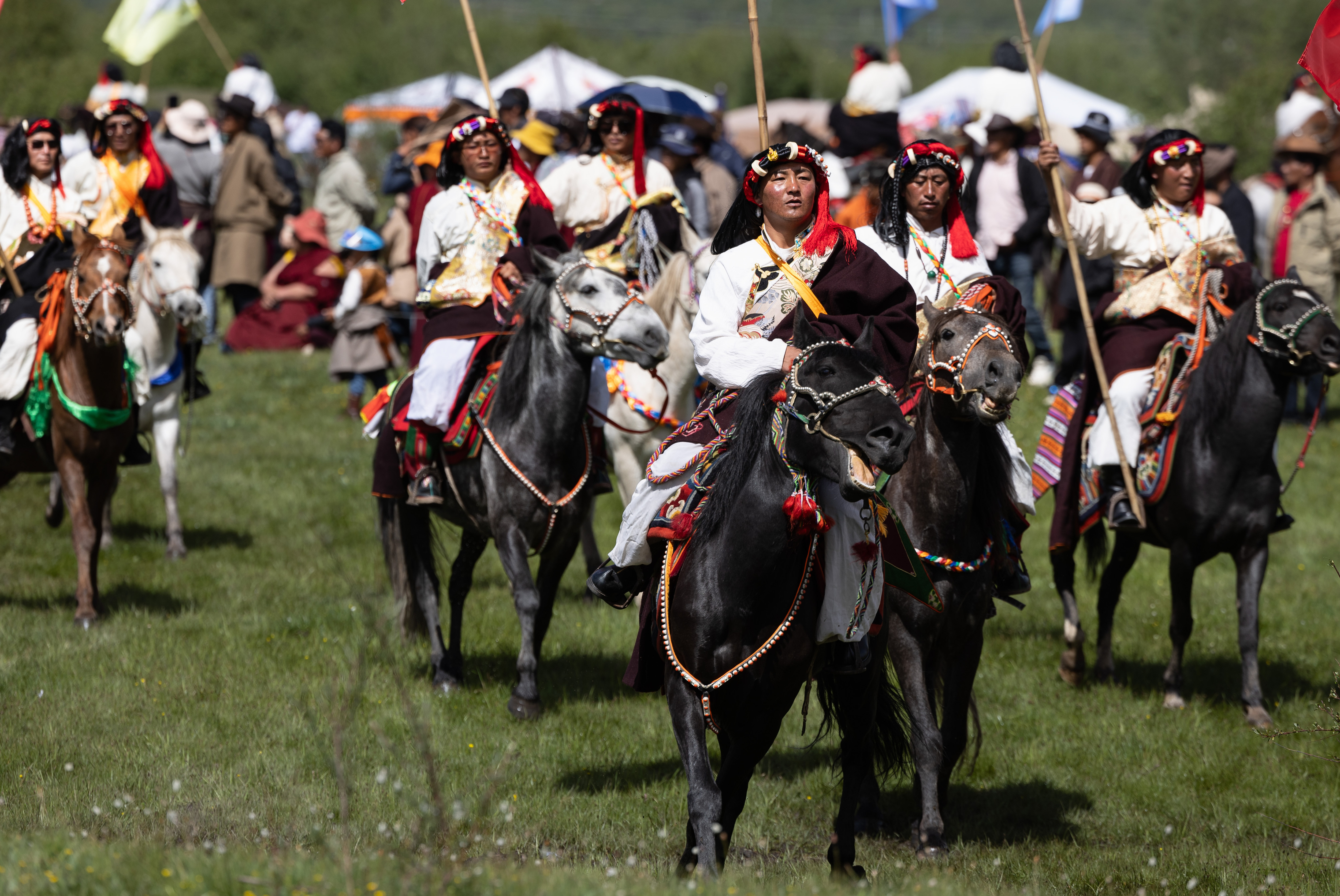 6月26日至29日,在四川省红原县麦洼寺附近,当地藏族群众搭起帐篷,身着节日盛装,带着隆达、青稞进行煨桑祈福,参与赛马、群众趣味体育、歌舞表演等活动,欢度一年一度的煨桑节活动。煨桑节是藏族祭祀节日,一般在夏季举行,主要是为了祈求丰收、平安和祛病等。