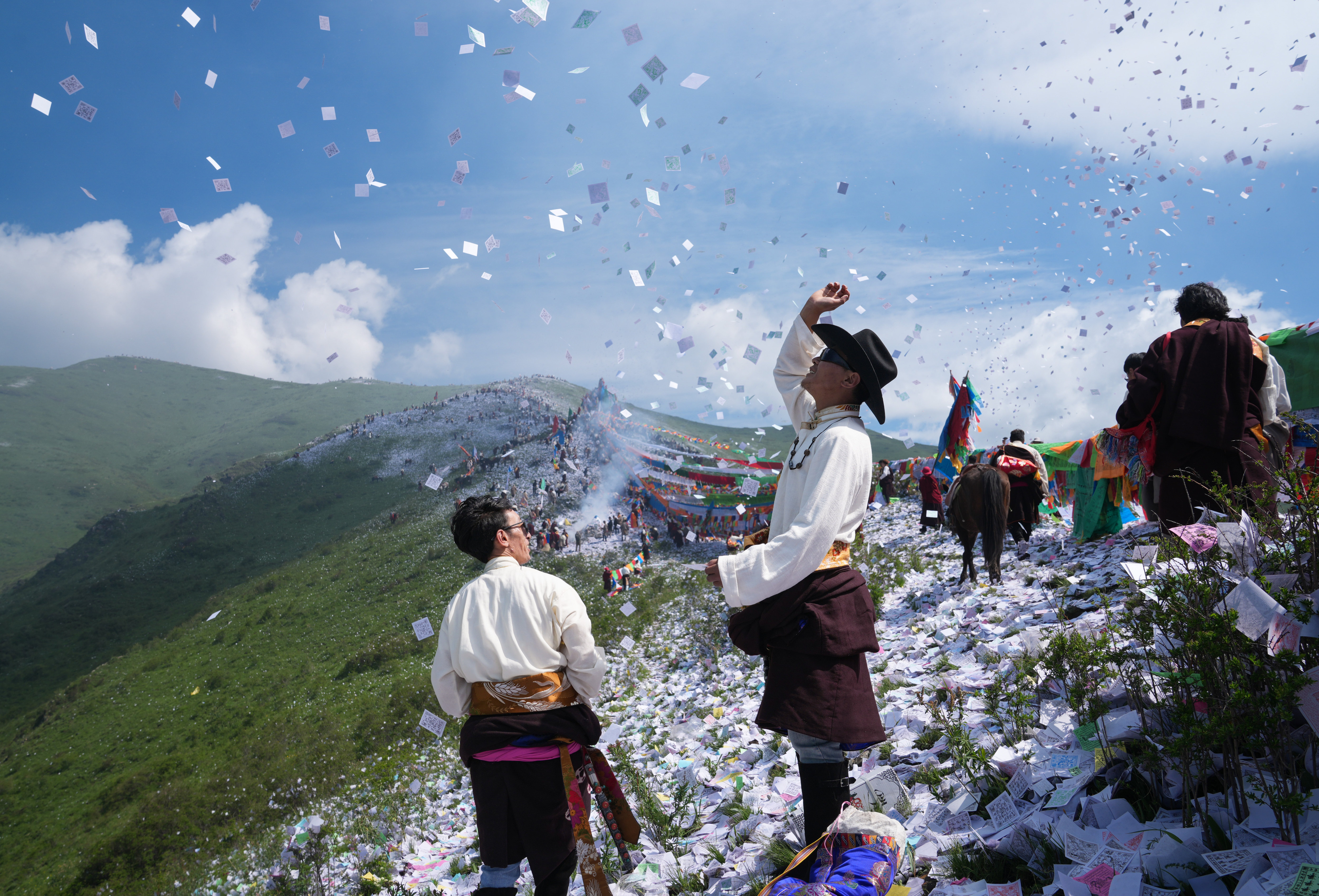 6月26日,当地群众向天空抛撒隆达进行煨桑祈福。