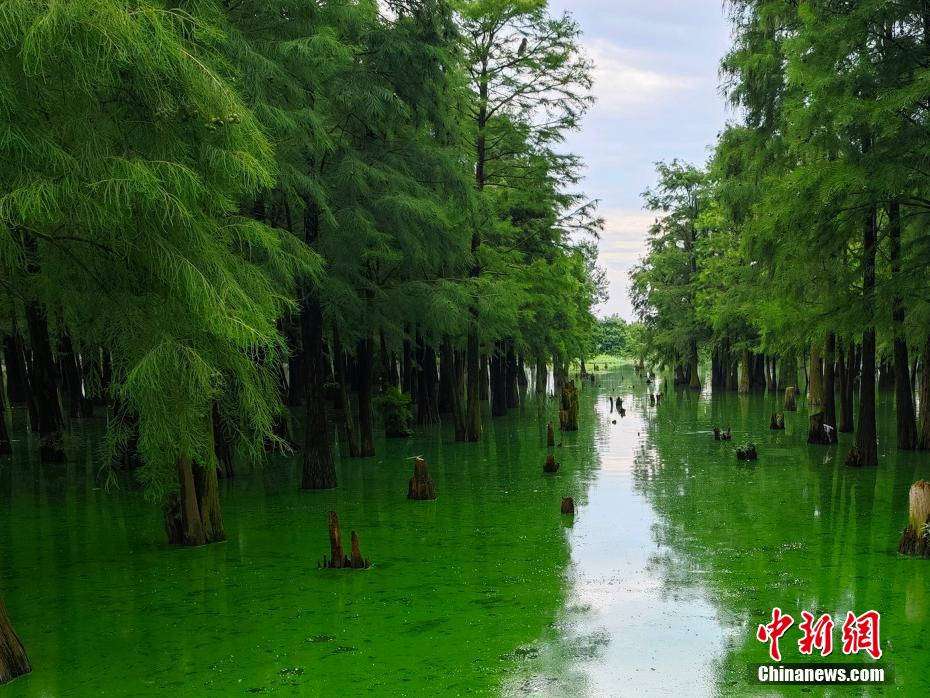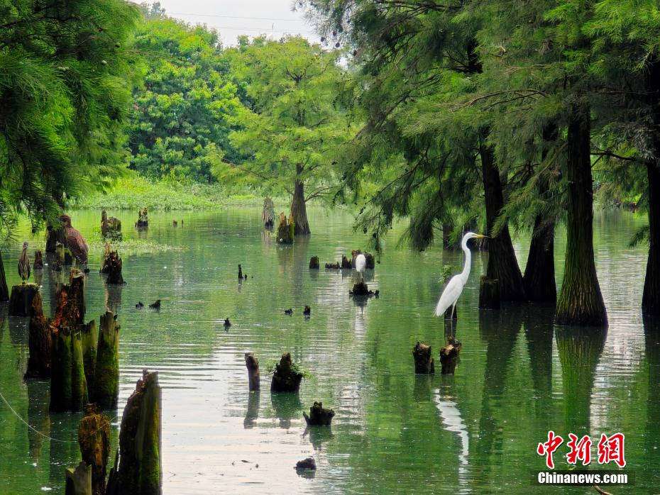 位于江西省南昌市南昌县塔城乡湖陂村的水岚洲湿地中央生长着茂密的池杉林,被当地誉为“水杉秘境”。夏日里,不时可以看到优雅的白色鹭鸟振翅掠过林间。它们在此繁衍栖息,轻盈的身姿为这片静谧的树林增添了几分灵动之美。微风拂过,树叶沙沙作响,伴随鸟鸣声声,让人仿佛置身于童话般的森林秘境之中。