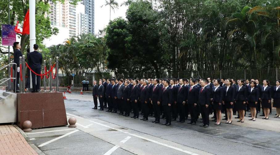 6月30日,香港国安法颁布实施五周年、中央人民政府驻香港特别行政区维护国家安全公署(简称“驻港国家安全公署”)成立五周年之际,驻港国家安全公署举行升国旗仪式。(图片来源:驻港国家安全公署供中新社图)
