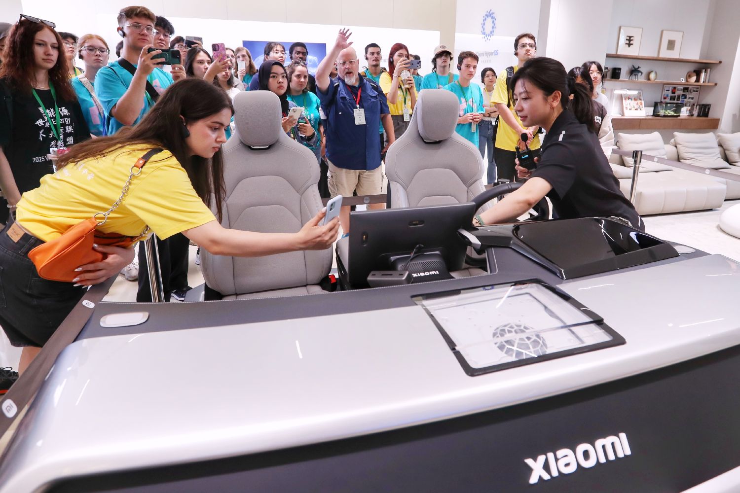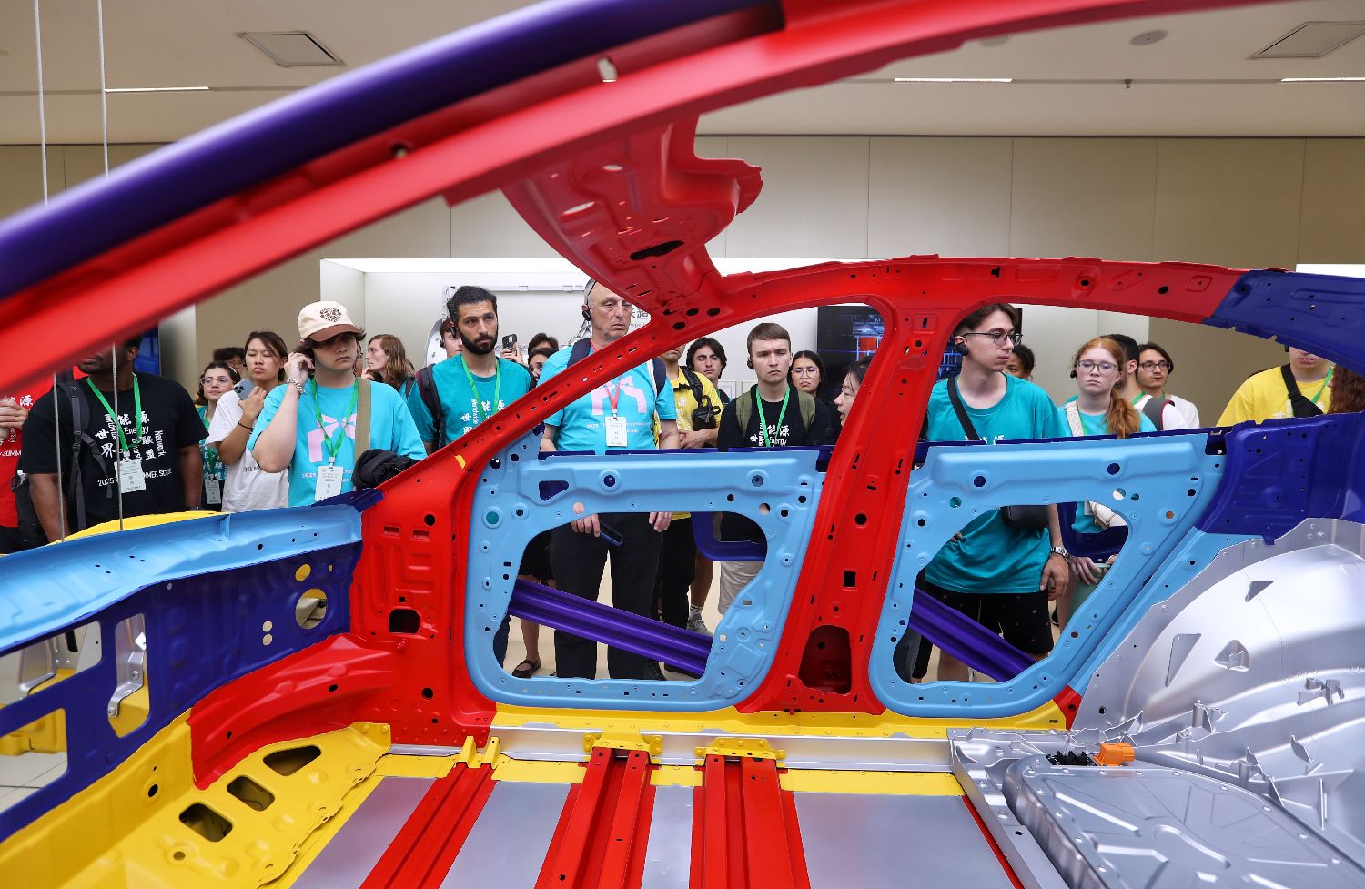 海外师生参观小米YU7的铠甲笼式钢铝混合车身。