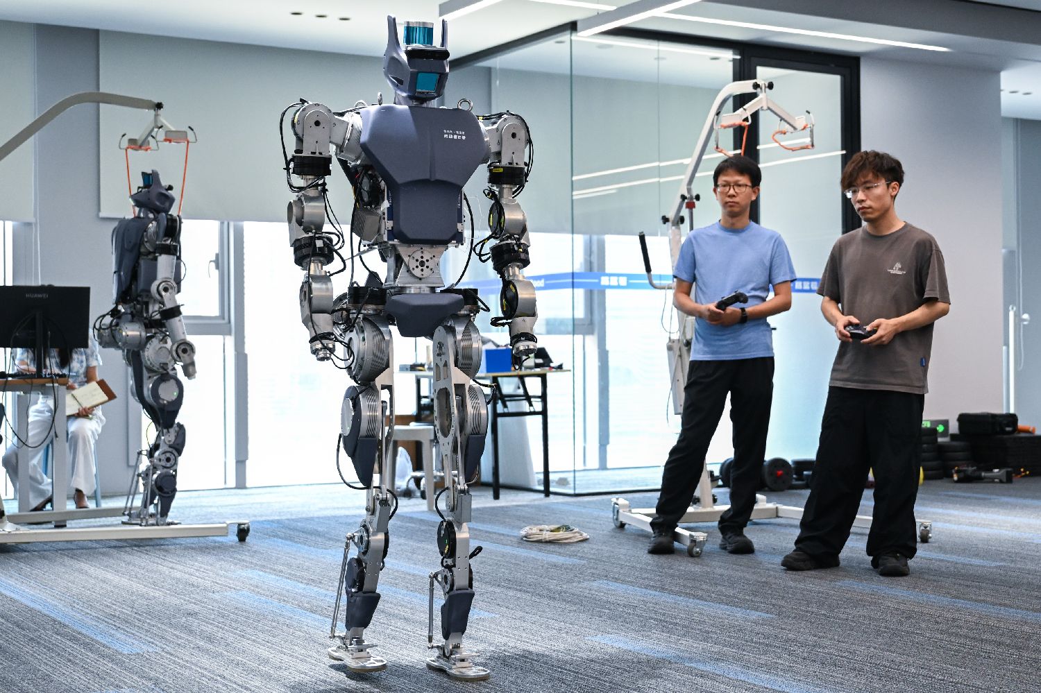 6月30日,在武汉格蓝若智能技术股份有限公司,华中科技大学博士研究生钱乐天(右一)和团队成员准备对“劳动者”系列人形机器人进行调试。(图片来源:本文图片均据新华社)