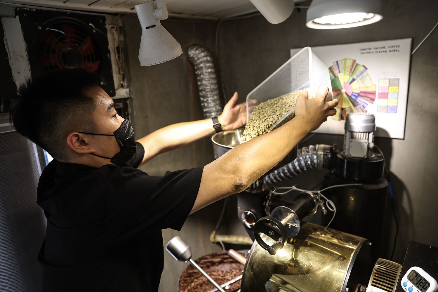 十年前,刘佳迪与朋友合伙开起了咖啡店。近年来,他发现消费者对咖啡品质的要求不断提高,对精品咖啡的需求越来越大。烘焙对咖啡风味的形成至关重要,他购置专业设备,在网上自学后,又到北京参加专业培训,逐渐系统地掌握了咖啡豆烘焙技艺。图为6月18日,刘佳迪给按顾客需求烘焙好的咖啡豆拍照,准备发货。