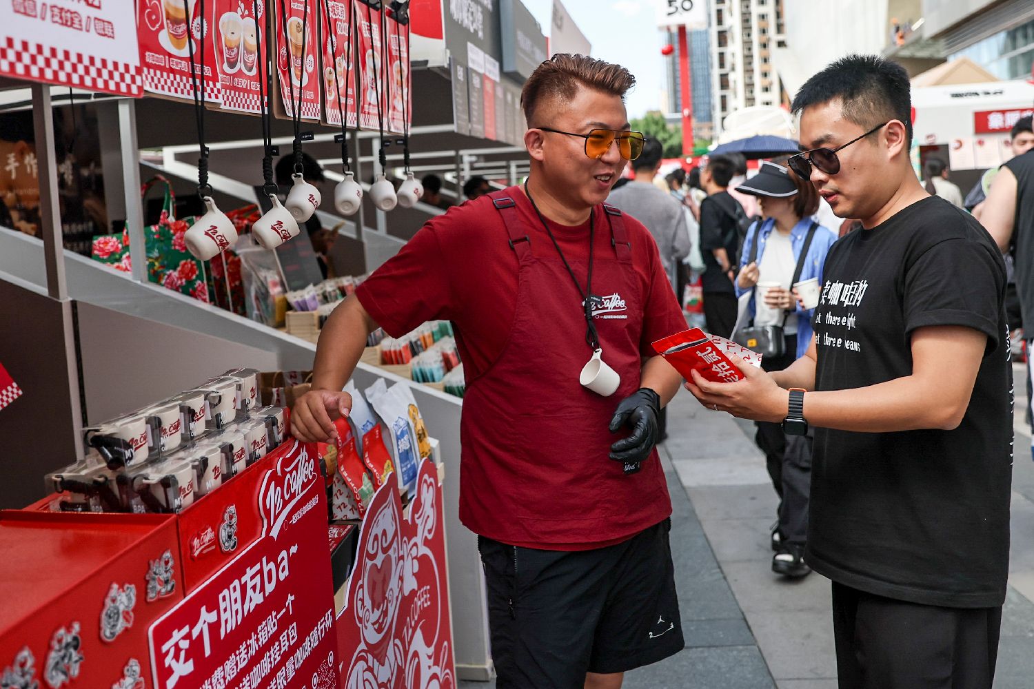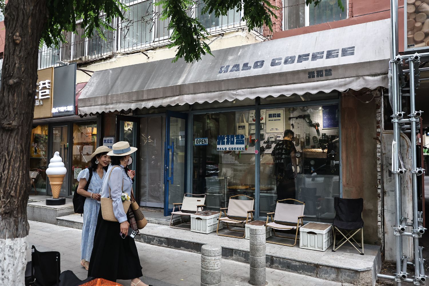 咖啡的普及程度越来越高,相关产业不断发展壮大,从种植、烘焙到制作、销售,咖啡产业链上的职业分工不断精细化和专业化,技能培训不断细化完善。图为6月18日,在沈阳“咖啡小巷”,游客从刘佳迪的店铺前经过。