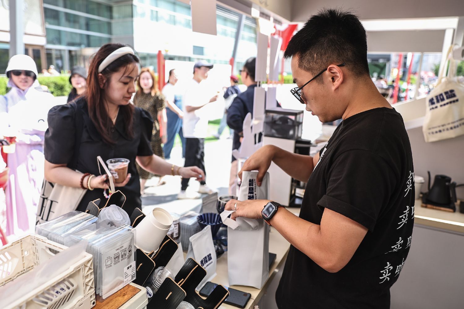 2025年,人社部发布公示,拟新增17个新职业,“咖啡加工工”位列其中。图为6月21日,在沈阳举行的咖啡市集上,刘佳迪(右)把顾客选购的咖啡豆装袋。