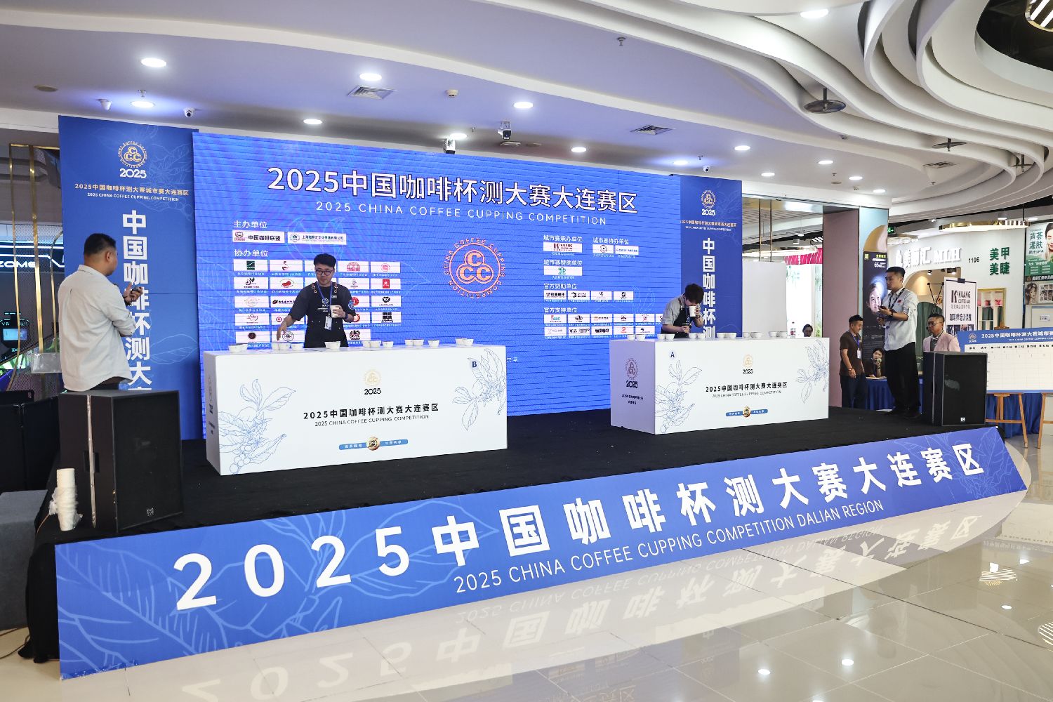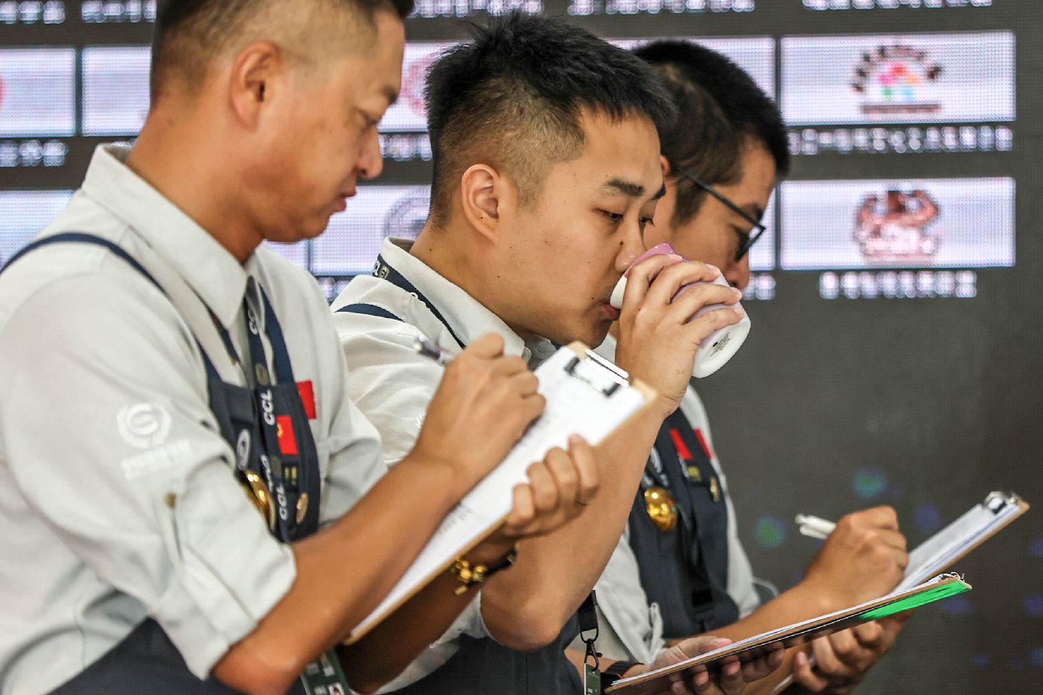 6月29日,刘佳迪(台上右一)在大连举办的一场咖啡杯测比赛中担任技术评审。