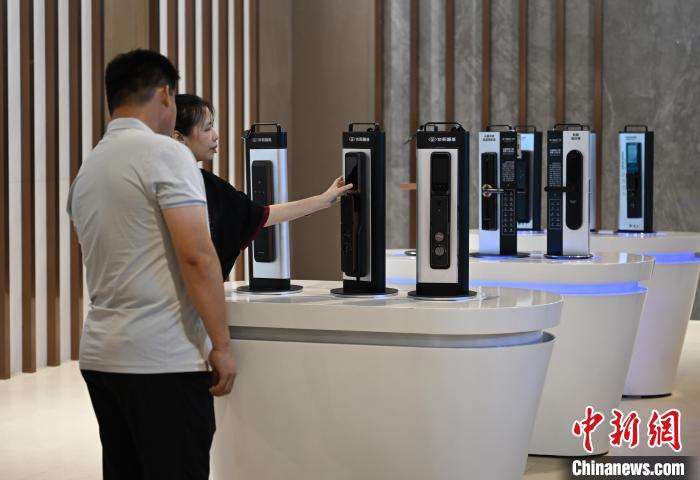 7月1日,浙江永康,参观者了解品类丰富的智能门锁,目前永康拥有智能门锁生产及配套企业2300多家。