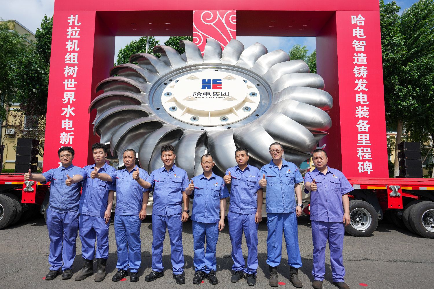近日,世界首台单机500兆瓦扎拉水电站冲击式水轮发电机组转轮在哈电集团哈尔滨电机厂有限责任公司自主研制成功,并于7月2日发运,标志着中国在高水头、大容量冲击式水轮机组核心装备领域实现历史性突破。图为7月2日,在哈电集团哈尔滨电机厂有限责任公司厂区,一线焊接人员合影留念。(图片来源:本文图片均自新华社)