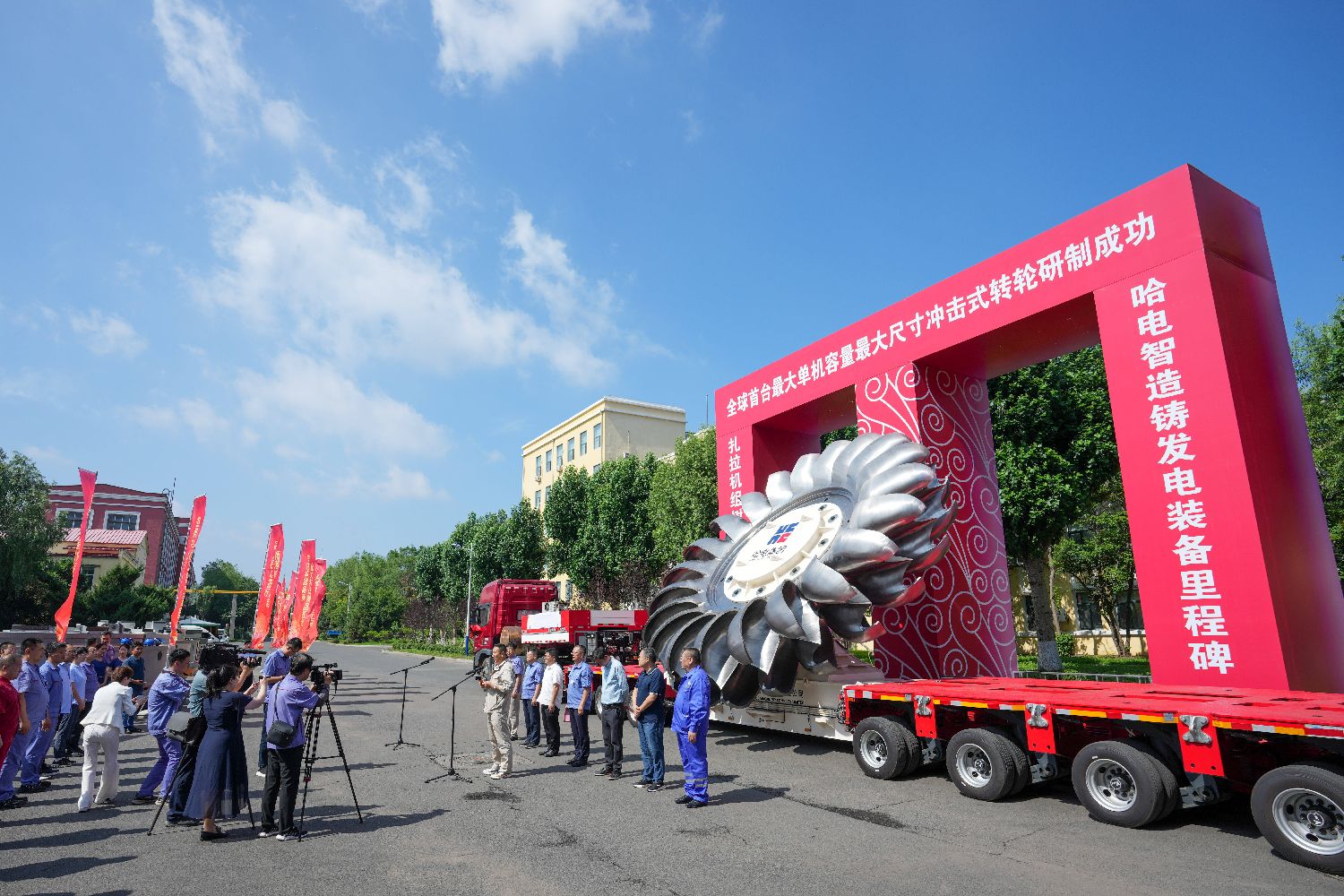 7月2日在哈电集团哈尔滨电机厂有限责任公司厂区拍摄的转轮研制成功启运仪式现场。