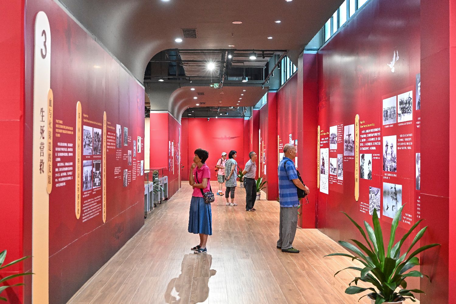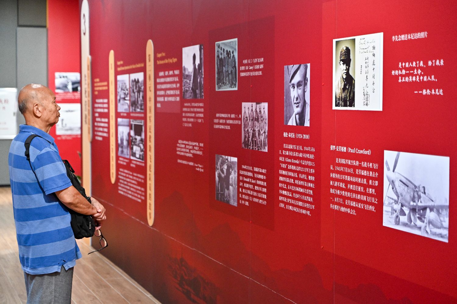 本次展览以“同盟抗敌”“并肩作战”“生死营救”“抗战胜利”为脉络,通过飞虎队相关历史图片107幅、历史实物10件,向观众讲述中美军民联合抗日并肩作战的故事。图为市民参观图片展。(图片来源:本文图片均自中新社)