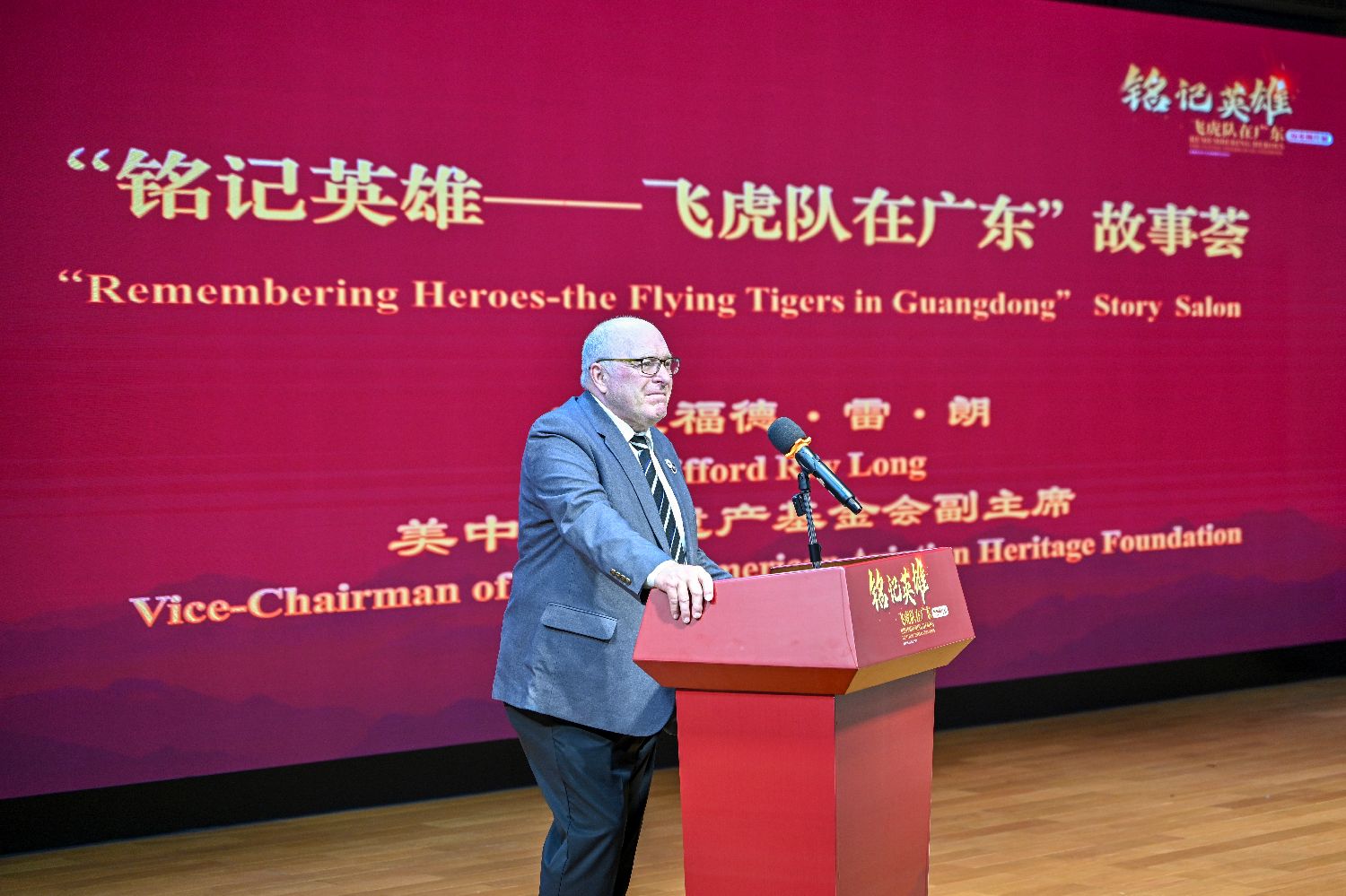 飞虎队队员后代克里福德·雷·朗在展览开幕式上讲述飞虎队故事。