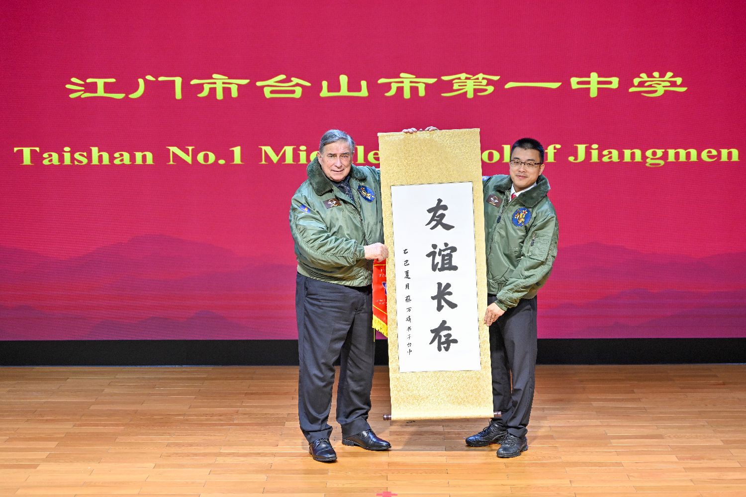 美中航空遗产基金会主席杰夫·格林(左)与“飞虎队友谊学校”代表互赠礼物。