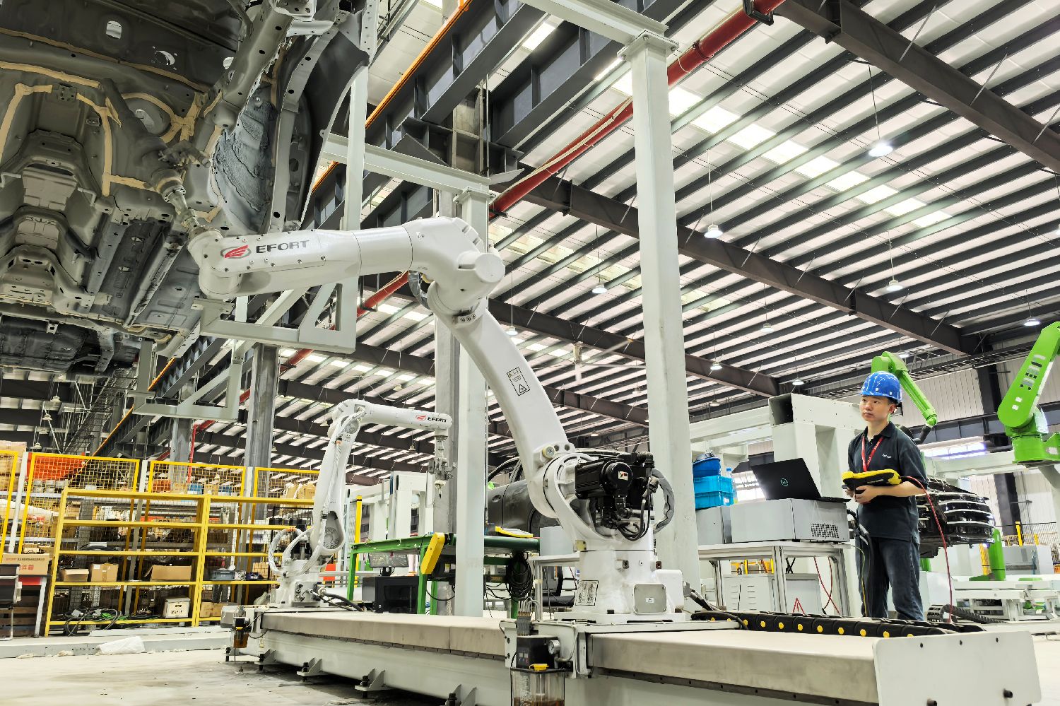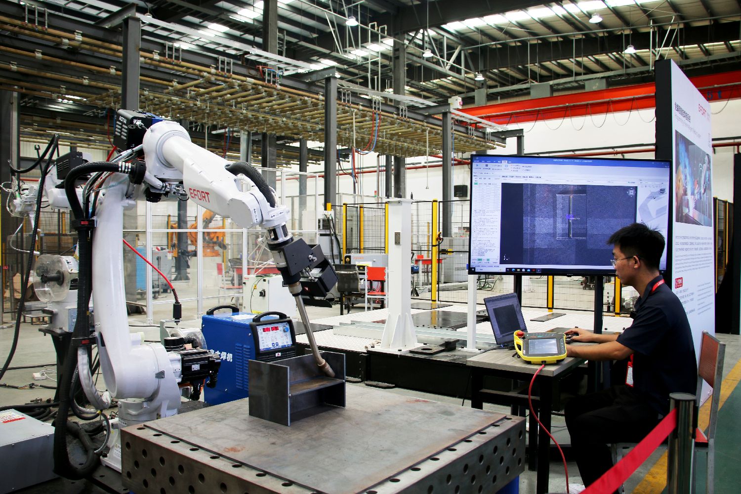 7月3日,在位于安徽芜湖的埃夫特智能机器人股份有限公司研发车间,工作人员正在对机器人焊接能力进行测试。“十四五”期间,安徽装备制造业迎来爆发式增长,年均增长率超13%,增速居长三角和中部地区第一,成为该省十大新兴产业中首个破万亿元人民币的产业。(图片来源:中新社)