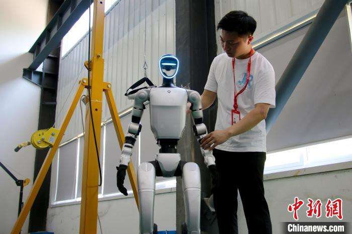 2024年,安徽装备制造业规上企业6590户,营收1.21万亿元人民币,工业机器人、数控机床、电工电气、农机装备等行业位居中国第一方阵。图为7月3日,埃夫特智能机器人股份有限公司一名工作人员正在检验人形机器人。(图片来源:中新网)