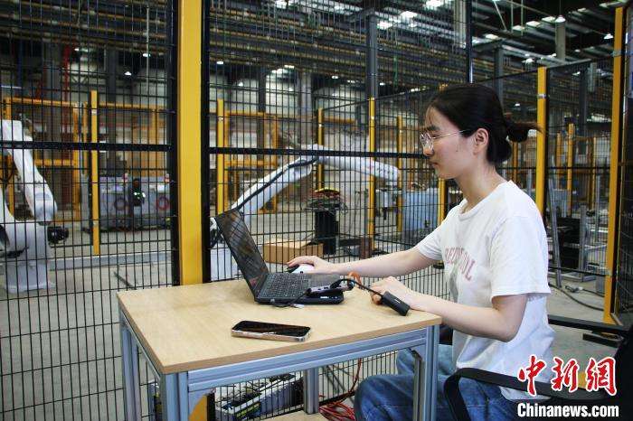 7月3日,埃夫特智能机器人股份有限公司一名工作人员正在对机器人进行测试。(图片来源:中新网)