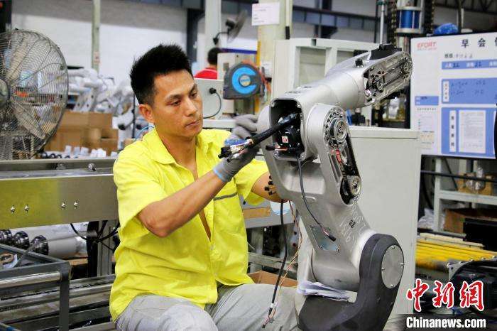7月3日,埃夫特智能机器人股份有限公司工作人员正在组装机器人零部件。(图片来源:中新网)