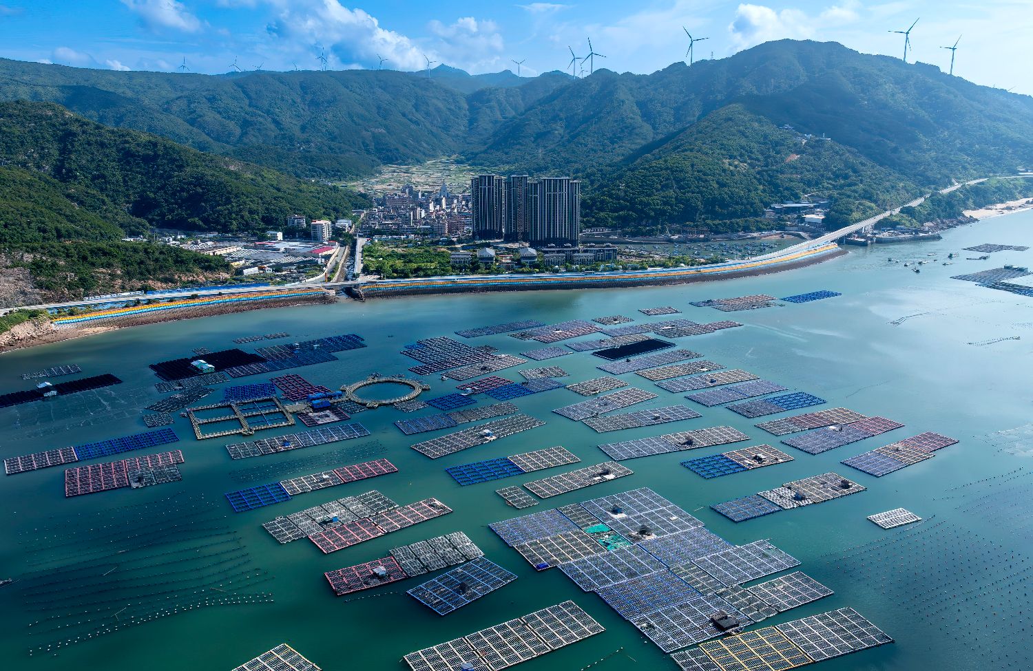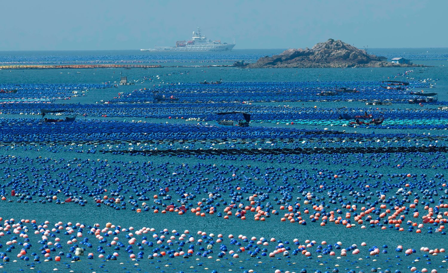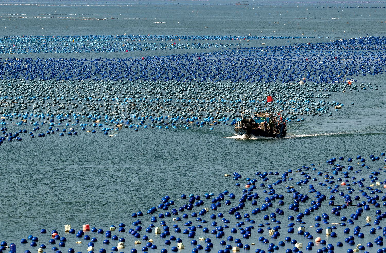 在连江县海域,养殖渔排与排列整齐的浮球交织出一幅多彩的“海上牧场”画卷(7月3日摄)。