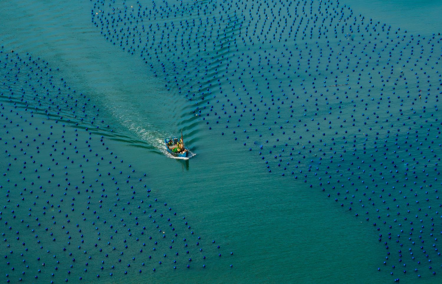 一艘海上作业渔船在连江县黄岐半岛海域海洋牧场中穿行(7月3日摄,无人机照片)。
