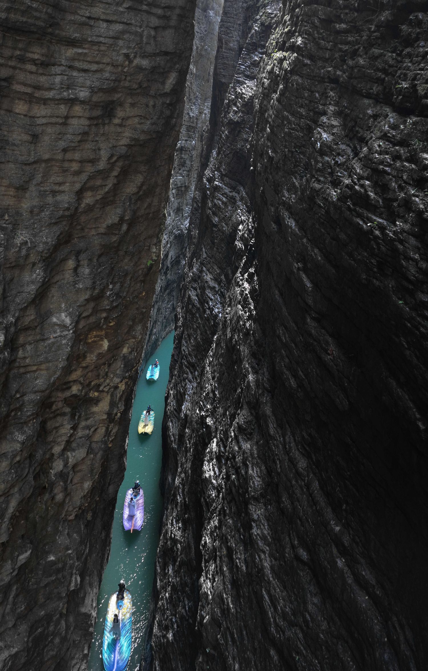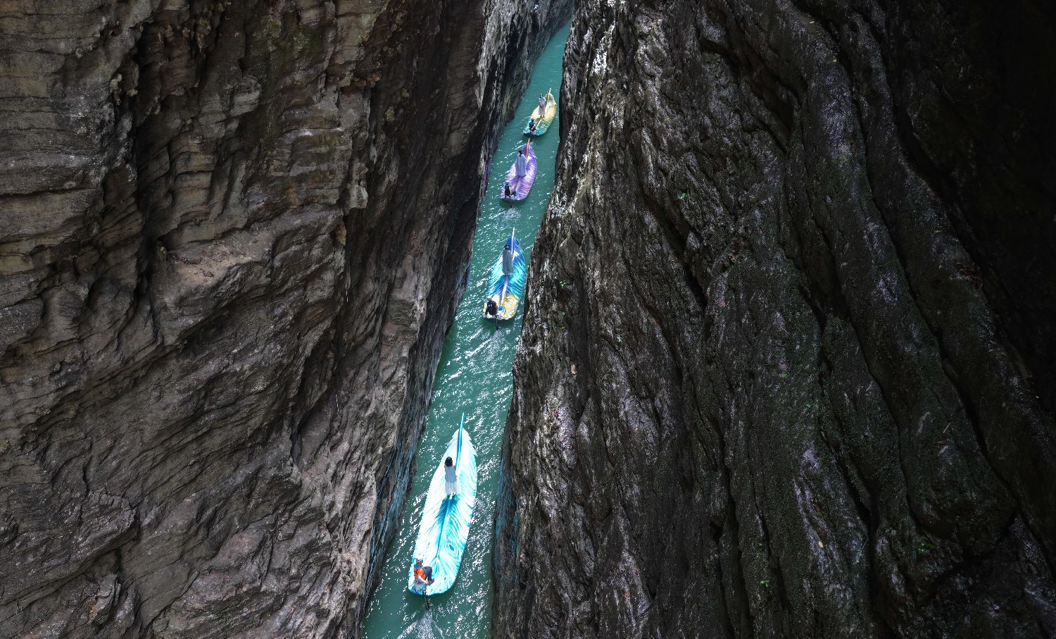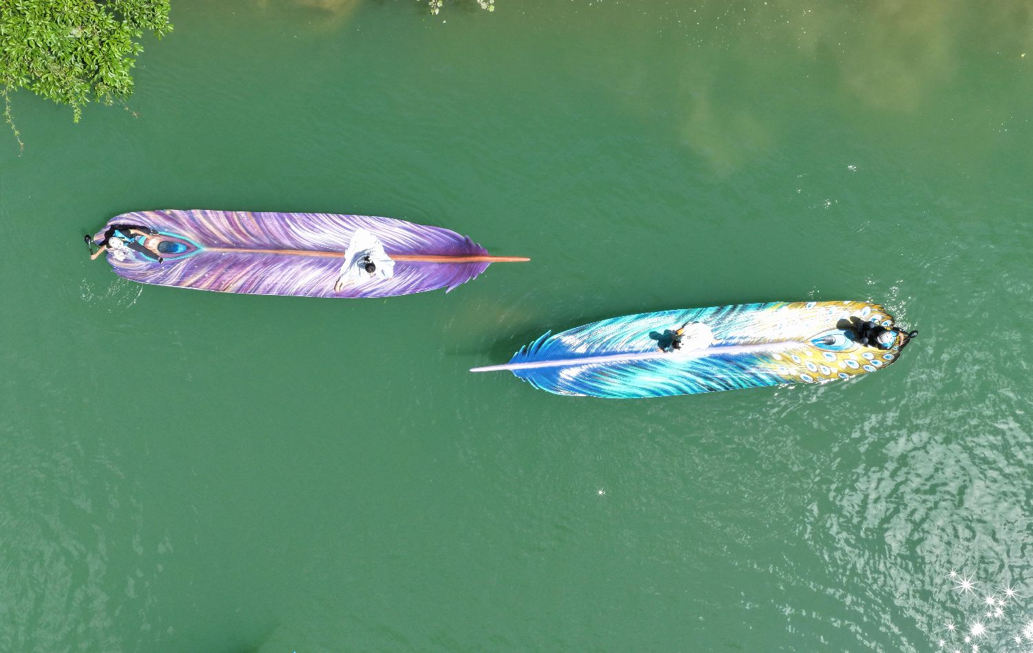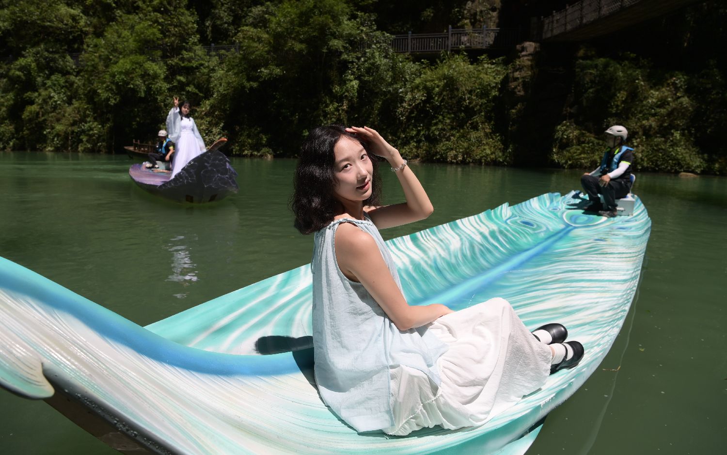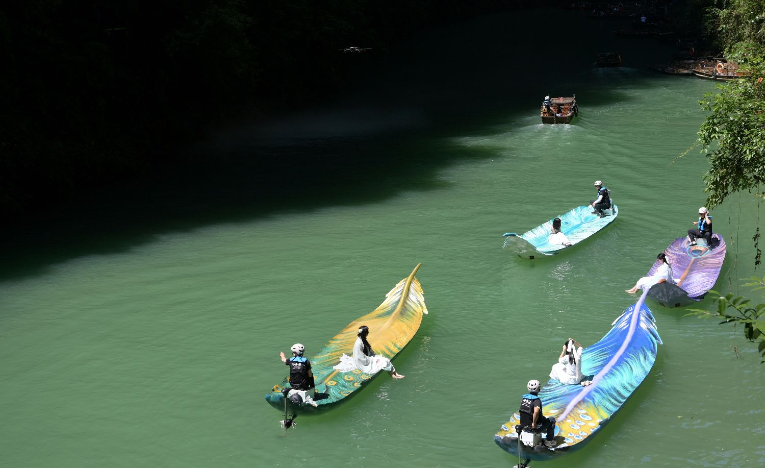 时值暑期旅游旺季,湖北省恩施土家族苗族自治州鹤峰县屏山旅游景区推出新文旅产品羽毛船,成为景区一道靓丽风景。