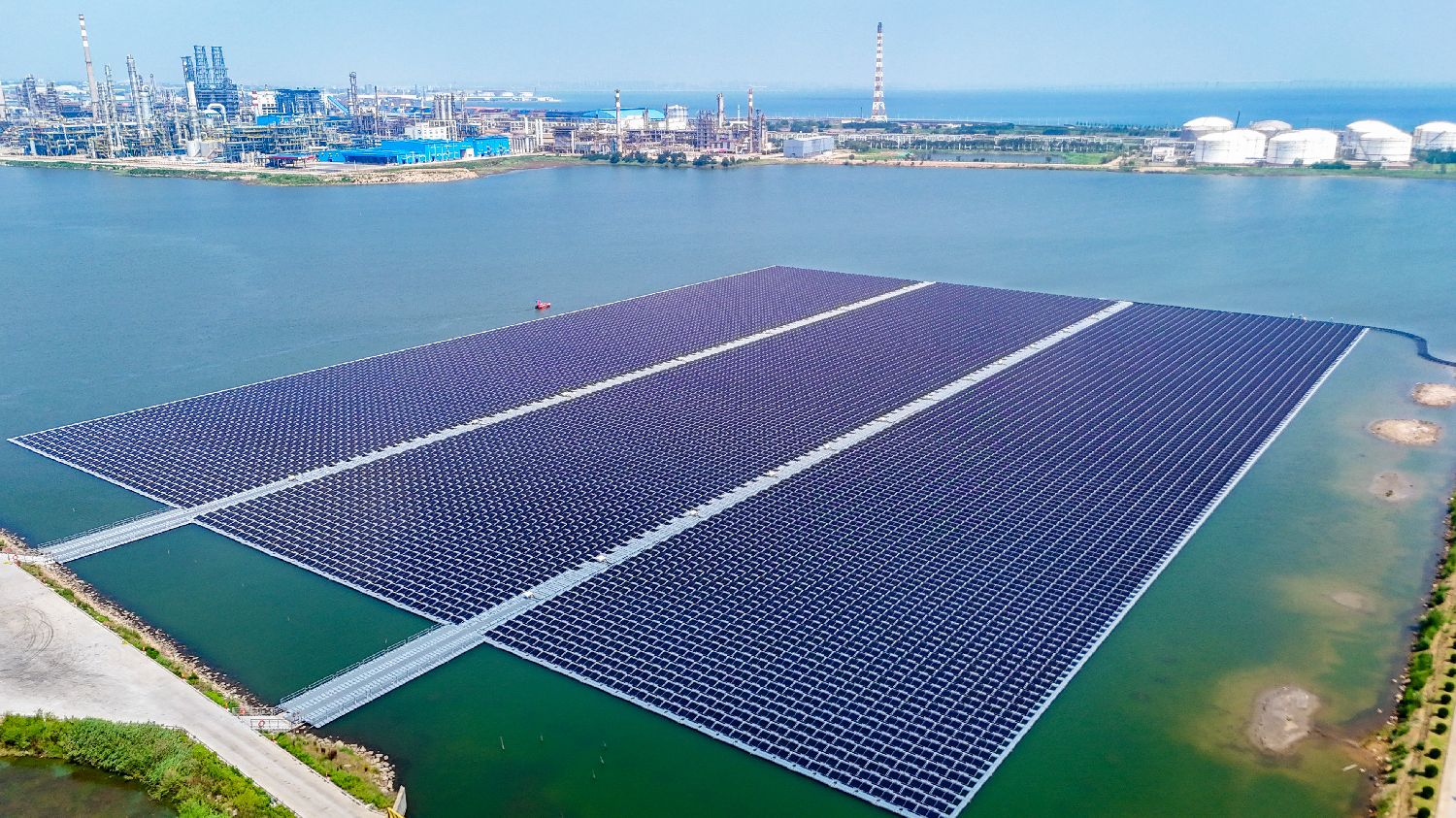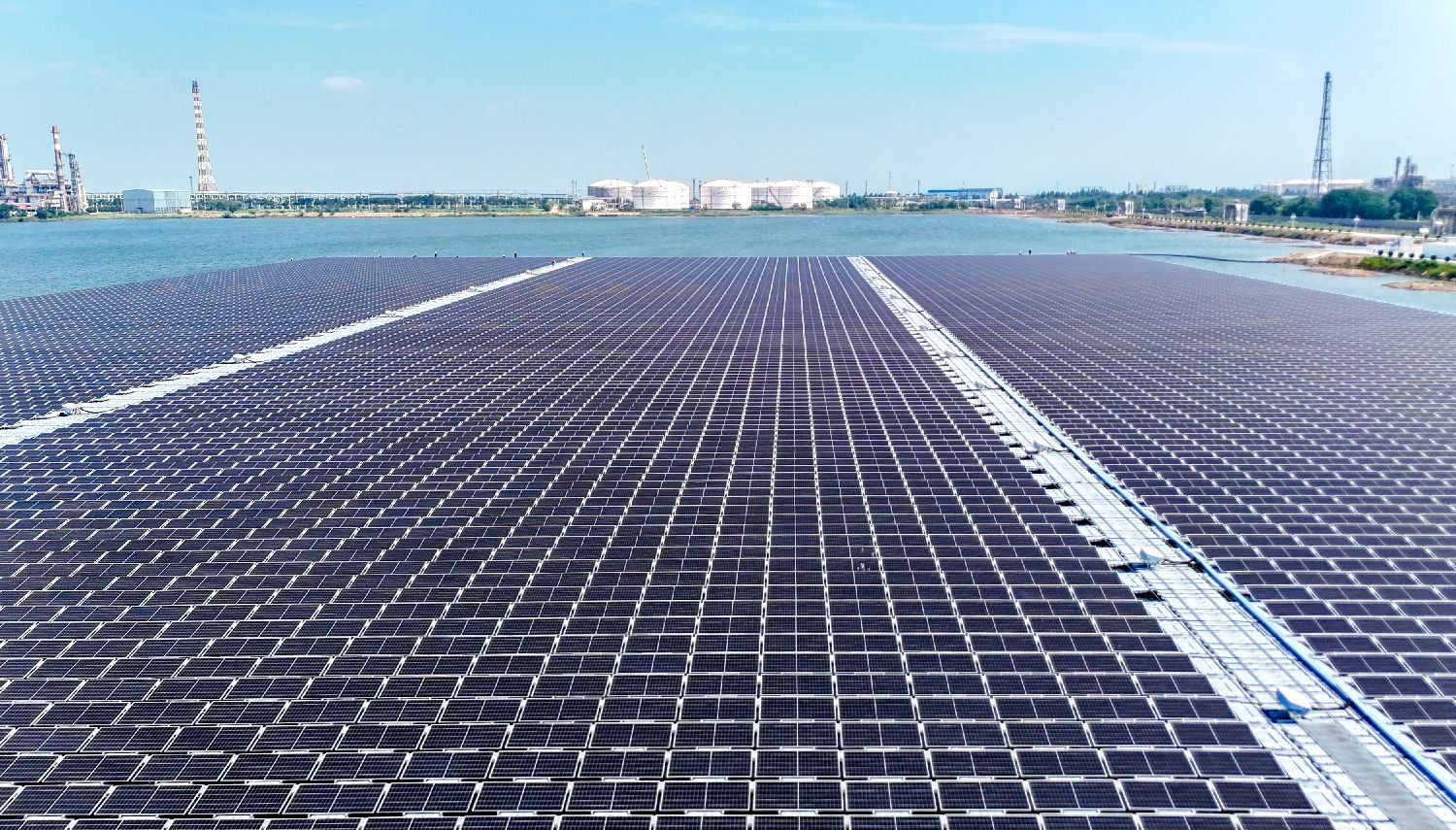 7月4日拍摄的中国石化青岛炼化全海水环境漂浮式光伏项目现场。近日,工厂化全海水漂浮式光伏项目在中国石化青岛炼化公司并网发电。(图片来源:本文图片均自新华社)