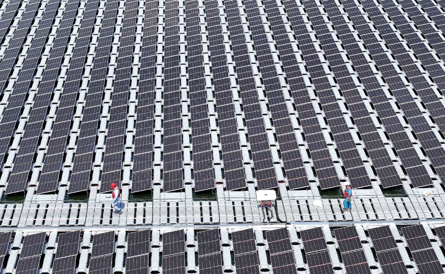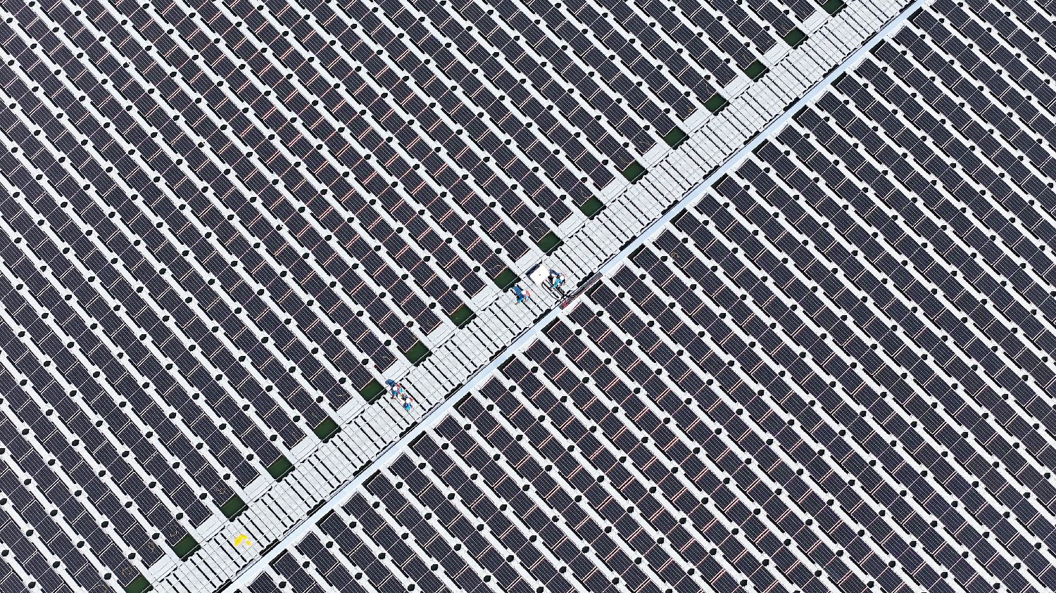 该项目位于山东青岛西海岸新区,装机容量7.5兆瓦,创新采用漂浮式结构,光伏板随潮汐升降贴近水面,利用海水高效散热提升发电效率。图为7月4日,在中国石化青岛炼化公司漂浮式光伏项目现场,工人在巡检。