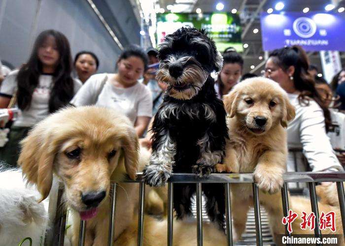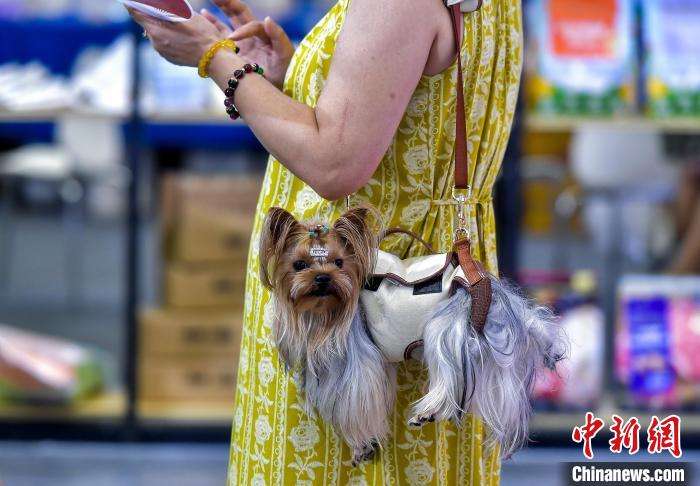 7月5日,呆萌可爱的宠物狗吸引观展者。