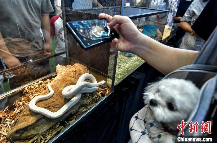 7月5日,一只宠物白蛇吸引携带自己宠物前来观展的市民拍摄。