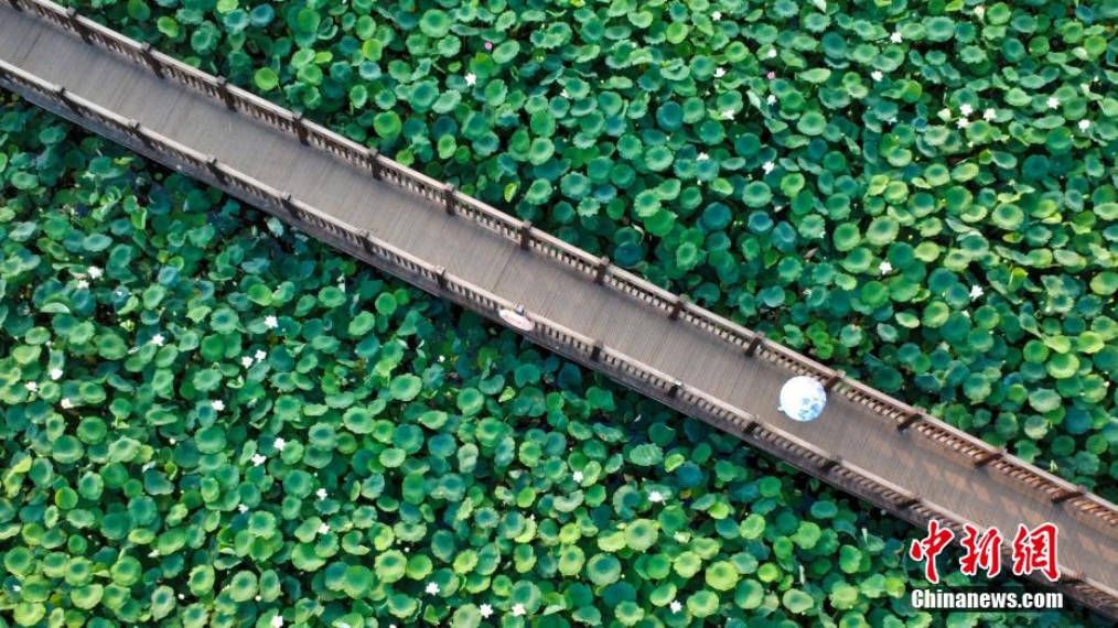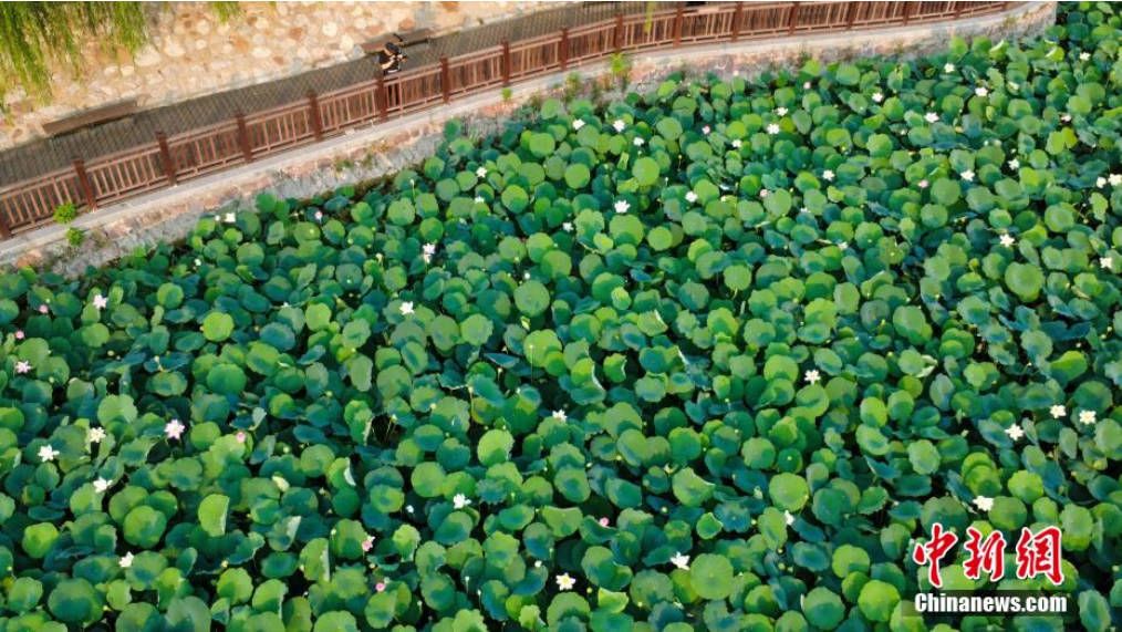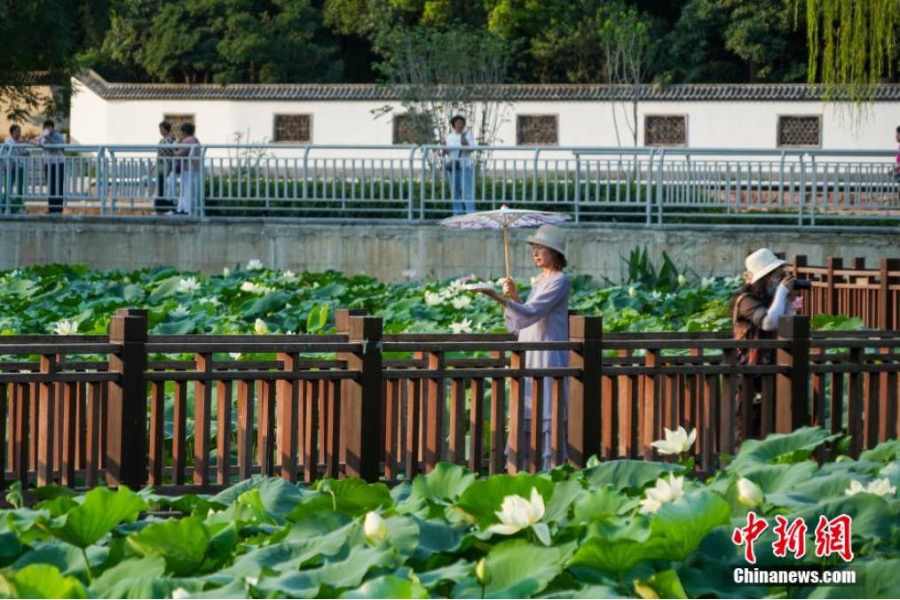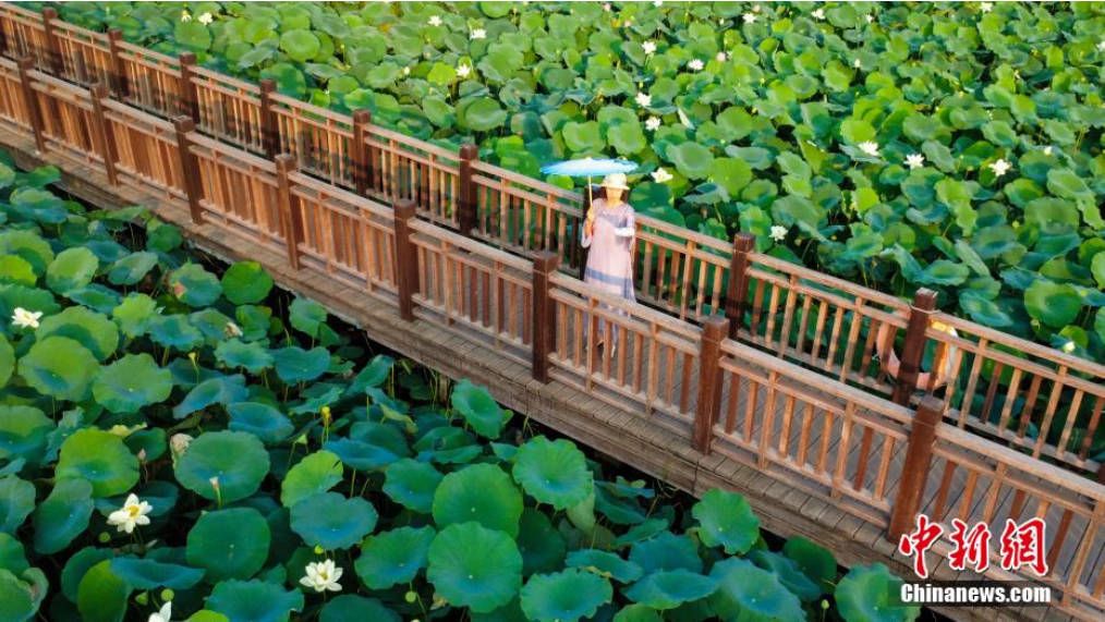 7月7日,河南郑州,市民在紫荆山公园赏荷栈道上欣赏荷花。(图片来源:本文图片均据中新网)