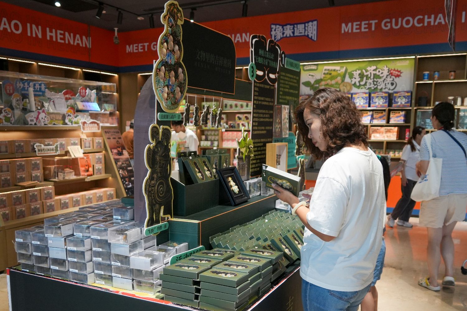 工作人员介绍,该文创产品推出一个多月,已售出近万个。图为7月8日,河南博物院“珐琅镶玉葫芦”文创产品吸引游客。(图片来源:中新社)