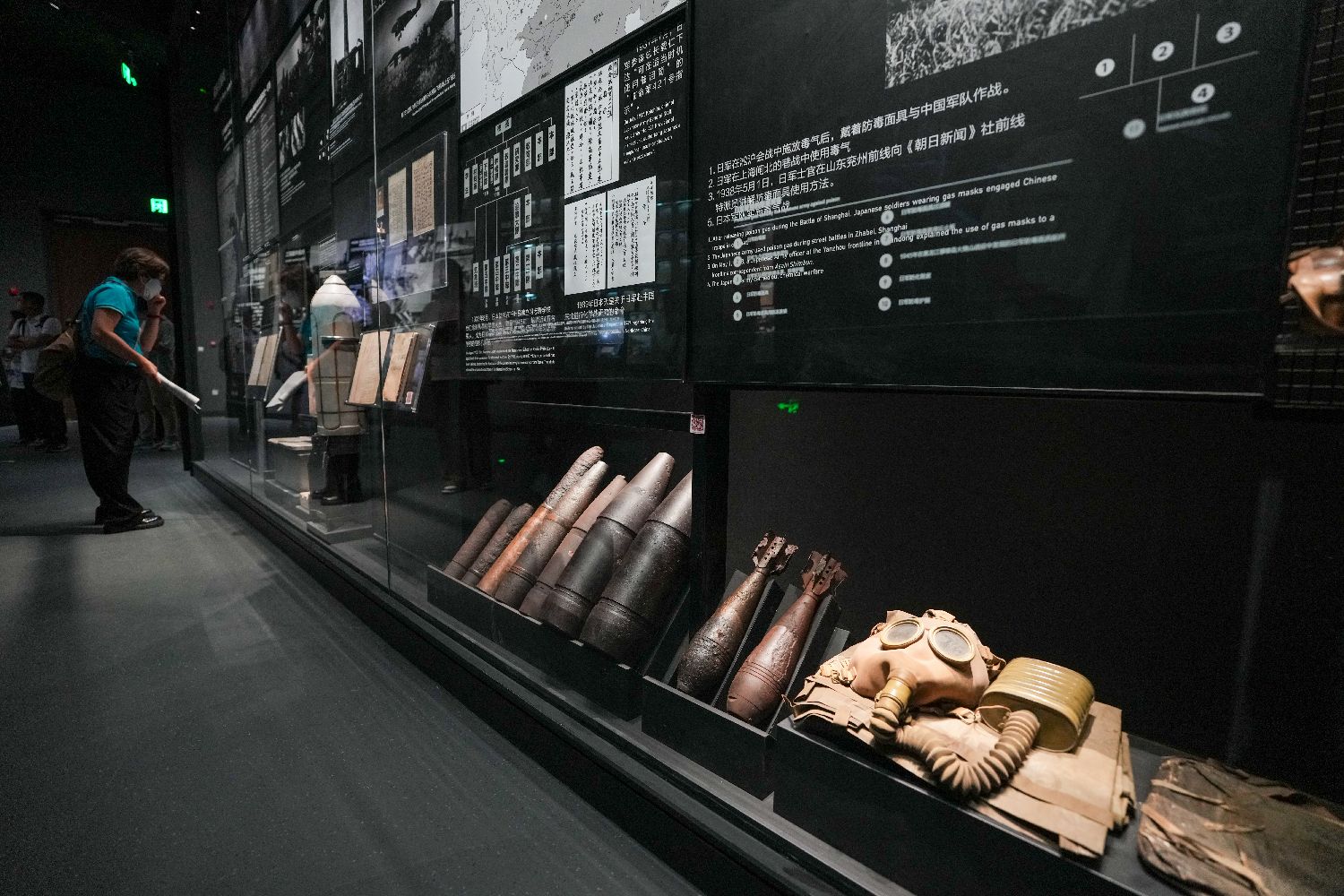 参观者在展示日本侵略者实施细菌战和化学战暴行的区域参观。