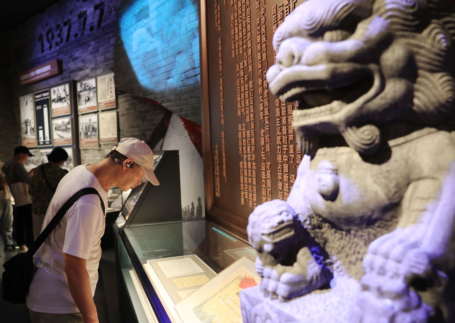参观者在中国人民抗日战争纪念馆参观《为了民族解放与世界和平》主题展览。