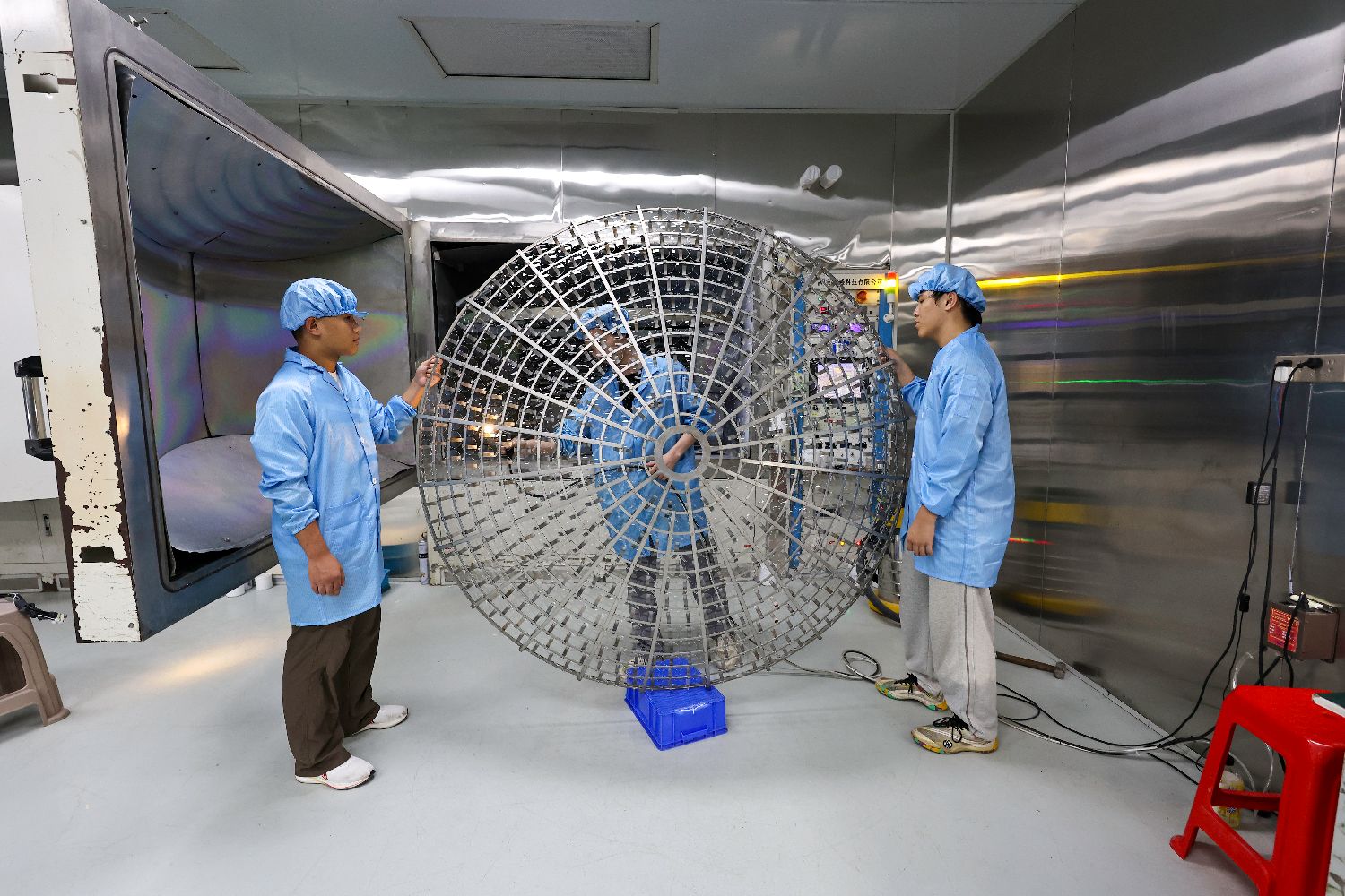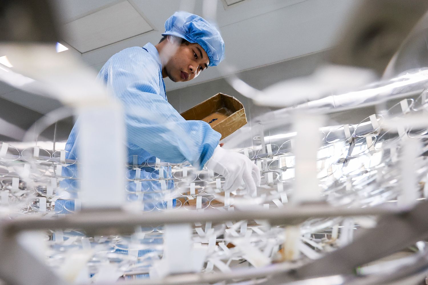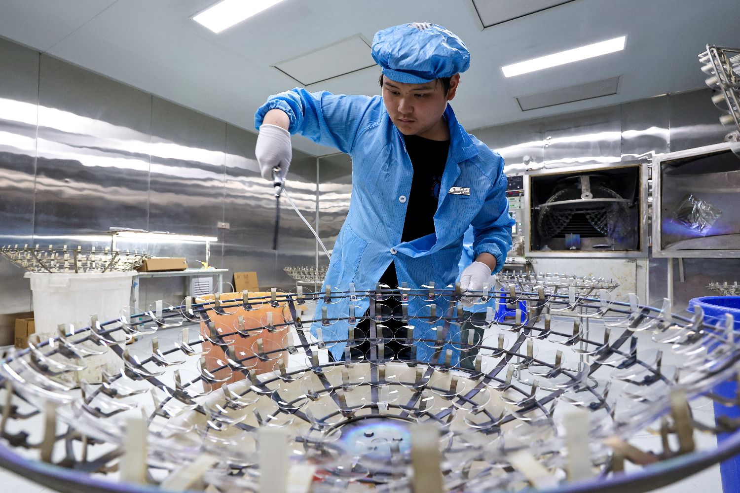 7月10日,在江西科强光学有限公司镀膜车间,工人将镜片放置在镀膜伞架中准备镀膜。
