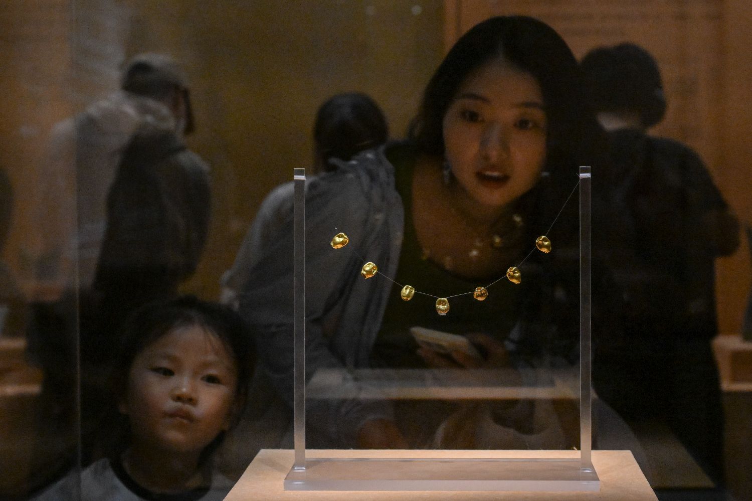 参观者驻足观看展品“金双耳罐串珠”。(图片来源:中新社)